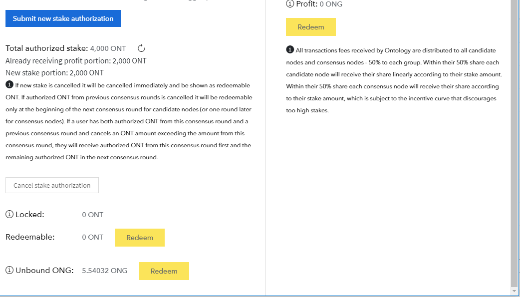 As seen above, when staking your ONT you will generate ONG passively which can be claimed at any time. Additionally you can stake your ONT to a Node and then will receive ONT & ONG after every completed round, which lasts 120.000 blocks. I will also post an update on this, as soon as the current round ends ! ;)