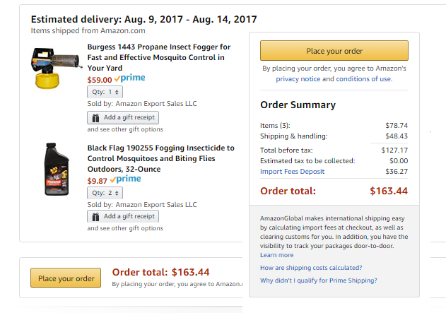These two items receive a discount on shipping when combined. The shipping, import fee deposit, and item costs total $163.64. The propane cannot be shipped internationally. It will have to be acquired on the ground. This is the largest expense item and I have the funds to personally pay for these items if I need to.