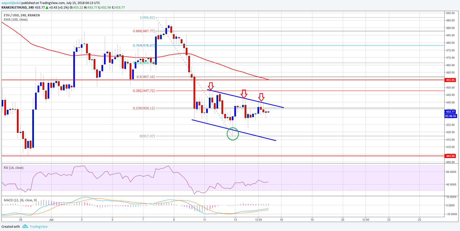 This past week, there were continuous declines in ETH price below the $475 resistance against the US Dollar. The ETH/USD pair declined and broke the $460 and $455 support levels. It traded towards the $415 level and a low was formed at $417.37. Later, there was an upside correction and the price moved above the $430 level. Moreover, the price succeeded in breaking the 23.6% fib retracement level of the last drop from the $497 swing high to $417 low.