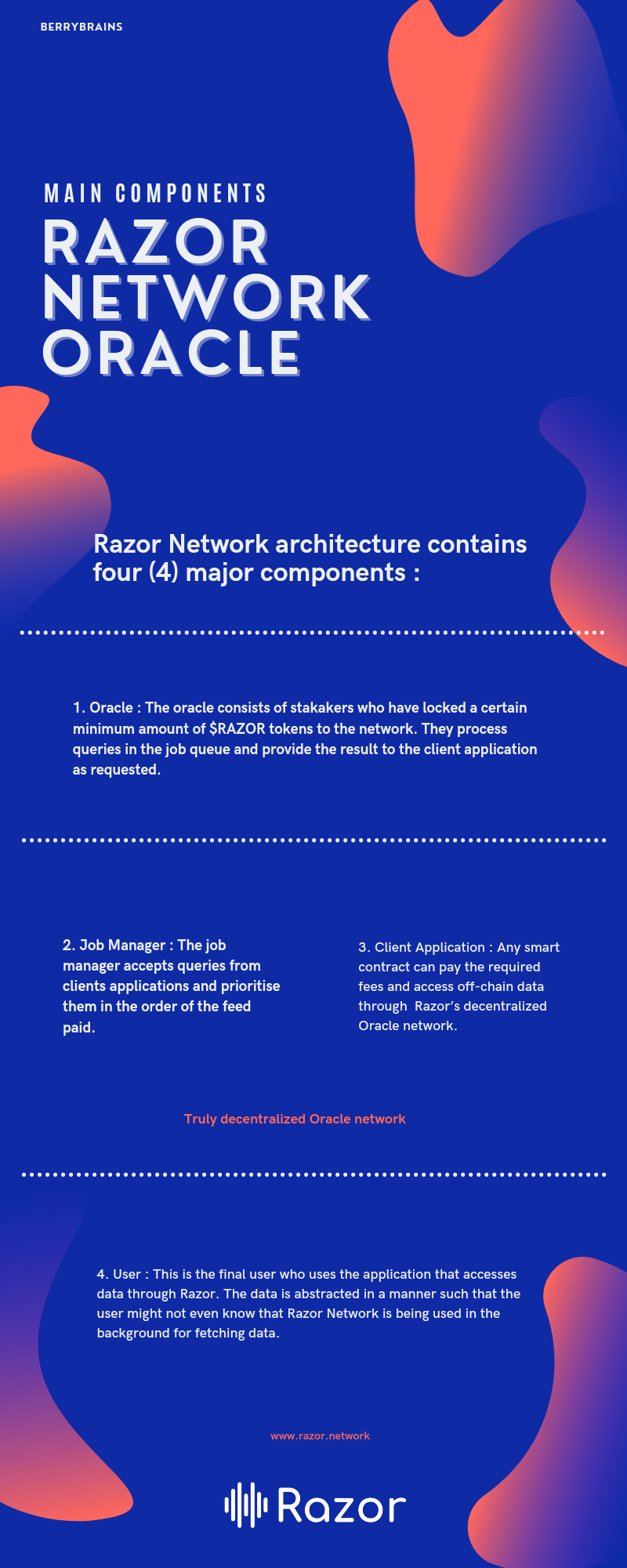 Razor Oracle Network main components.berrybrains (25)in #oracles • 5 years ago RazorNetwork, the truly decentralized Oracle network has series of amazing components, ranging from Oracle, Job manager, Client application and user. Learn more about these components in the attached infographic!