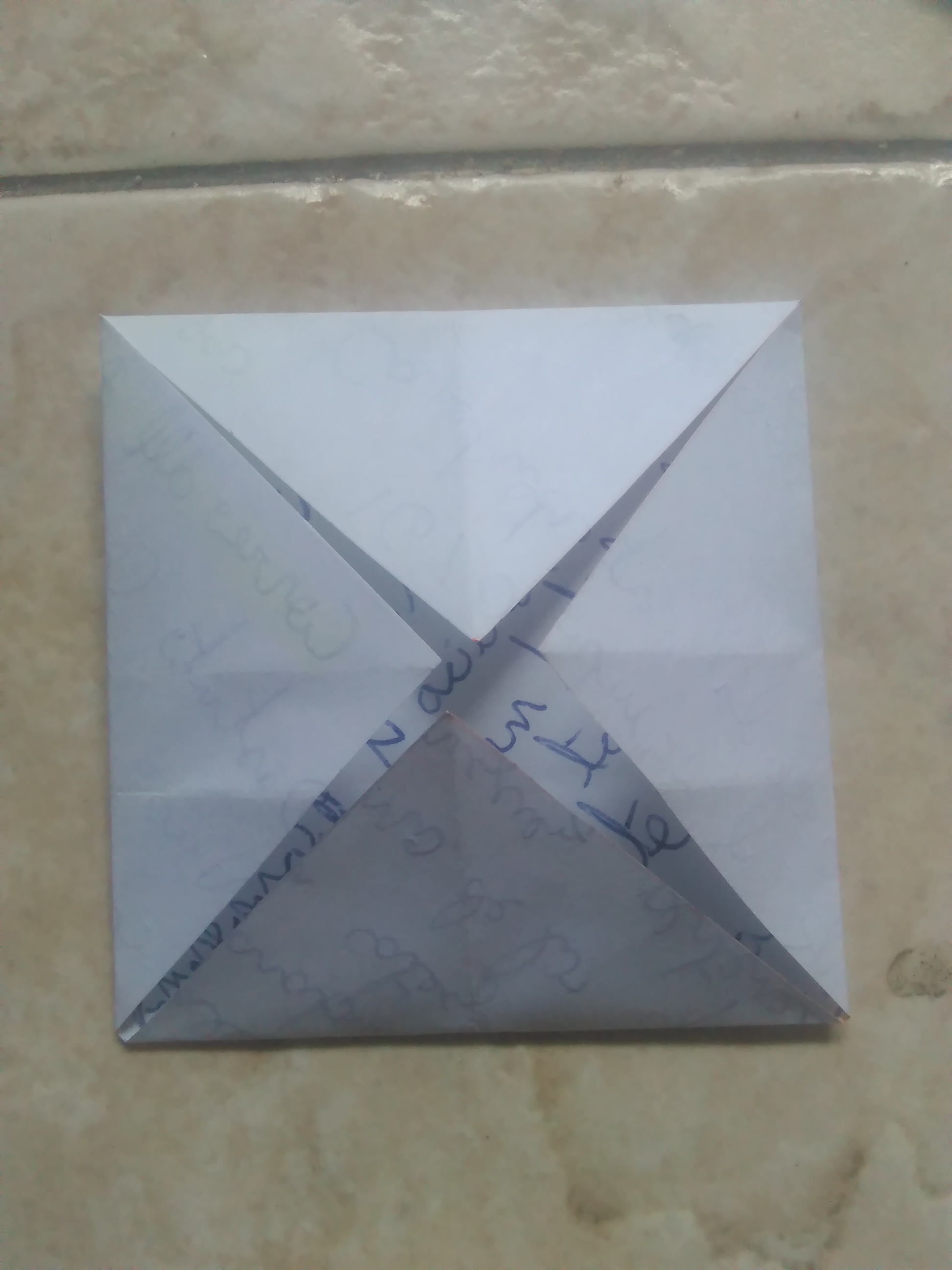 Con los pliegues ya marcados vamos a llevar cada esquina hacia el centro de esta manera:
