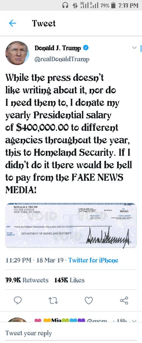 While the press doesn’t like writing about it, nor do I need them to, I donate my yearly Presidential salary of $400,000.00 to different agencies throughout the year, this to Homeland Security. If I didn’t do it there would be hell to pay from the FAKE NEWS MEDIA!.