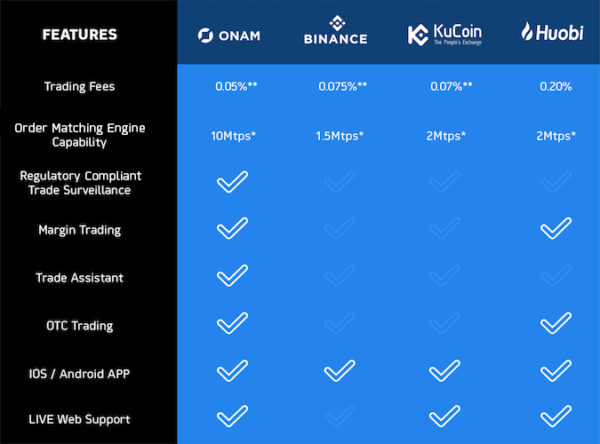 With the increase in crypto adopters, it has become necessary for exchanges to be designed in a way that unrestricted users can be accommodate in future. Unlike most exchanges ONAM platform is designed in such a way that unrestricted users can gain access to it platform. Its ultra- high performance and its special matching engine is capable of processing in excess of 10million transactions per second with latencies as low as 40 nanoseconds, making use of the GoLang programming language.