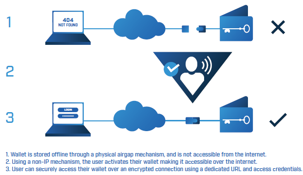 Goldilock using its patent-pending technology, would bring together both hot and cold storage, creating an additional physical layer of security and protocol that is not in the market, this in turn creates an anonymous platform for hackers to operate. This solves the problem of data and keys being stolen by hackers.