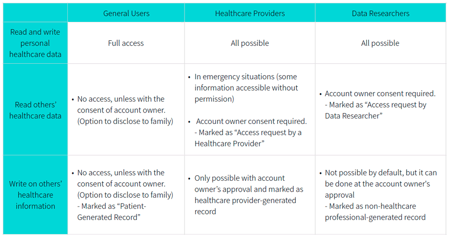 These are the rules in Medibloc Platform, however certain conditions apply; In cases where the patient is unable to manage their account, it could be handled by a family member. In addition, the patient can previously mark important information; blood type for example, so that it is handled by the consumer in case of emergencies.