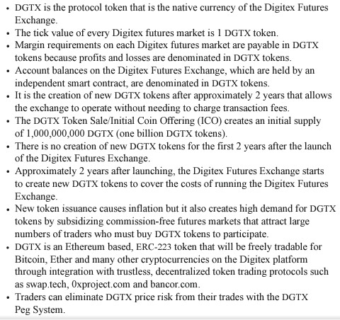 this would serve as what microorganisms call the mitochondria i.e the power house of Digitex futures and is as well one of the major features of this platform it is an ERC-223 capable protocol token which is based on eutherium blockchain and traders who participate in the Digitex futures exchange must poses the token and it's is significant because it the native currency of Digitex futures