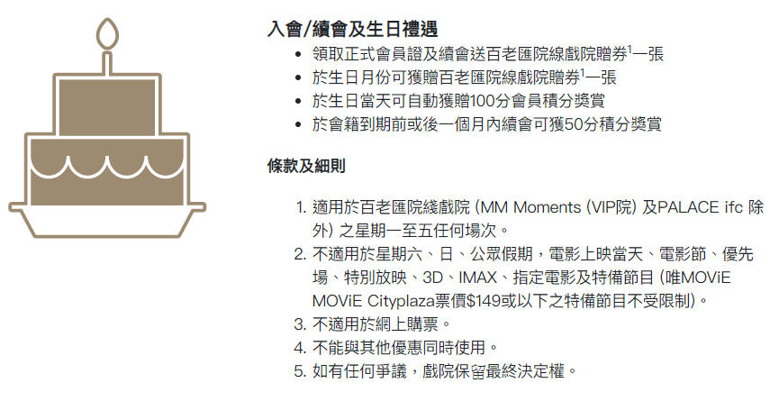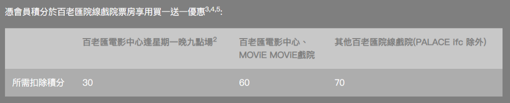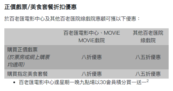 以我最常用嘅百老匯bc VIP (bcinephile) 會員為例,入會後消費可儲5%積分,即係$100戲飛就儲5分,之後可以用30/60/70分(視戲院而定)來換正價戲票買一送一優惠。