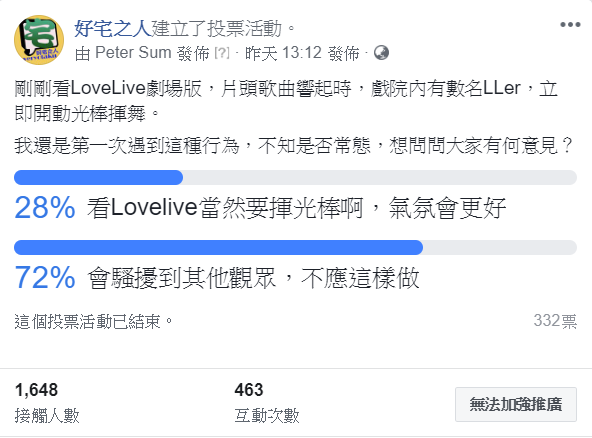 我很想知道宅人對此事有何看法,便在看畢電影回程時,立即在自己的facebook專頁「好宅之人」內出Post,問問各宅人的意見。為公平起見,我故意不發表自己的立場,只客觀地描述事發經過,再開投票功能做調查。投票者可以從1. 「當然要揮光棒」2. 「不應這樣做」兩個選項中揀一個。