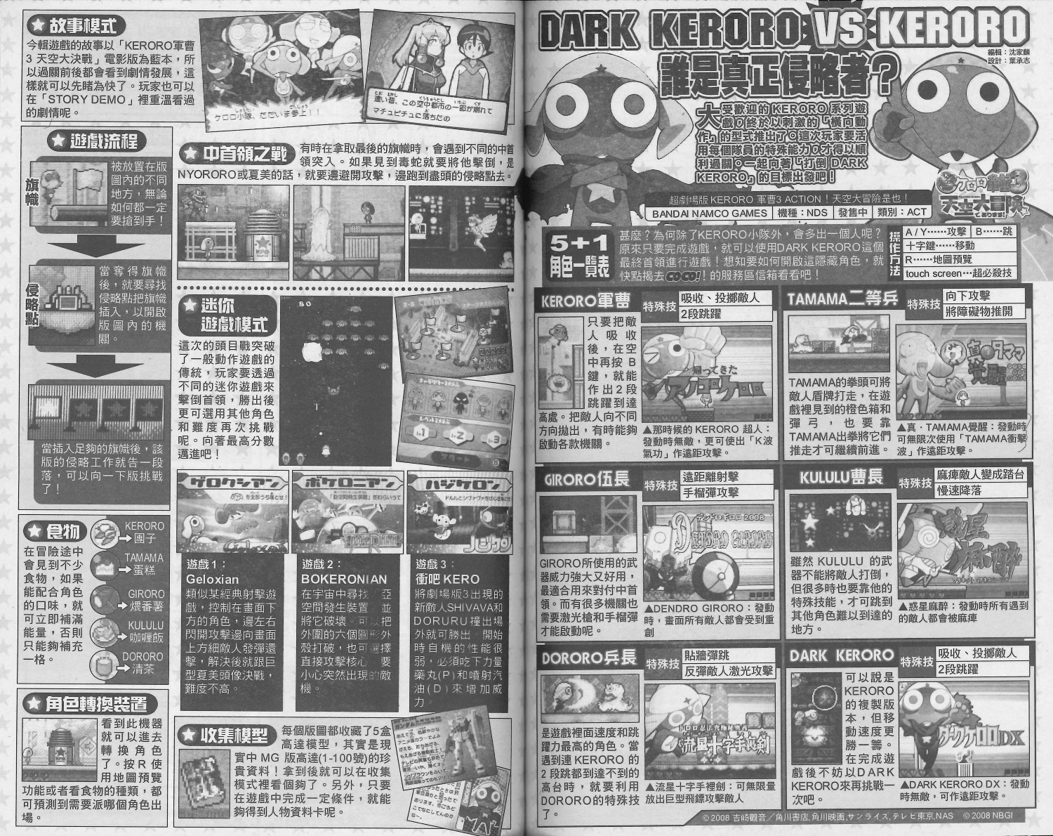 這版就是由我親手撰寫的遊戲攻略,遊戲正是當年大熱的《KERORO》劇場版3的衍生作品,在NDS上推出。以小品遊戲來說,質素算是不錯,不同角色的能力各異,有些版圖要轉對人才可過關,頗考腦筋。動作場面爽快,角色的必殺技也很有型,就算要打爆機,整個過程也相當享受。