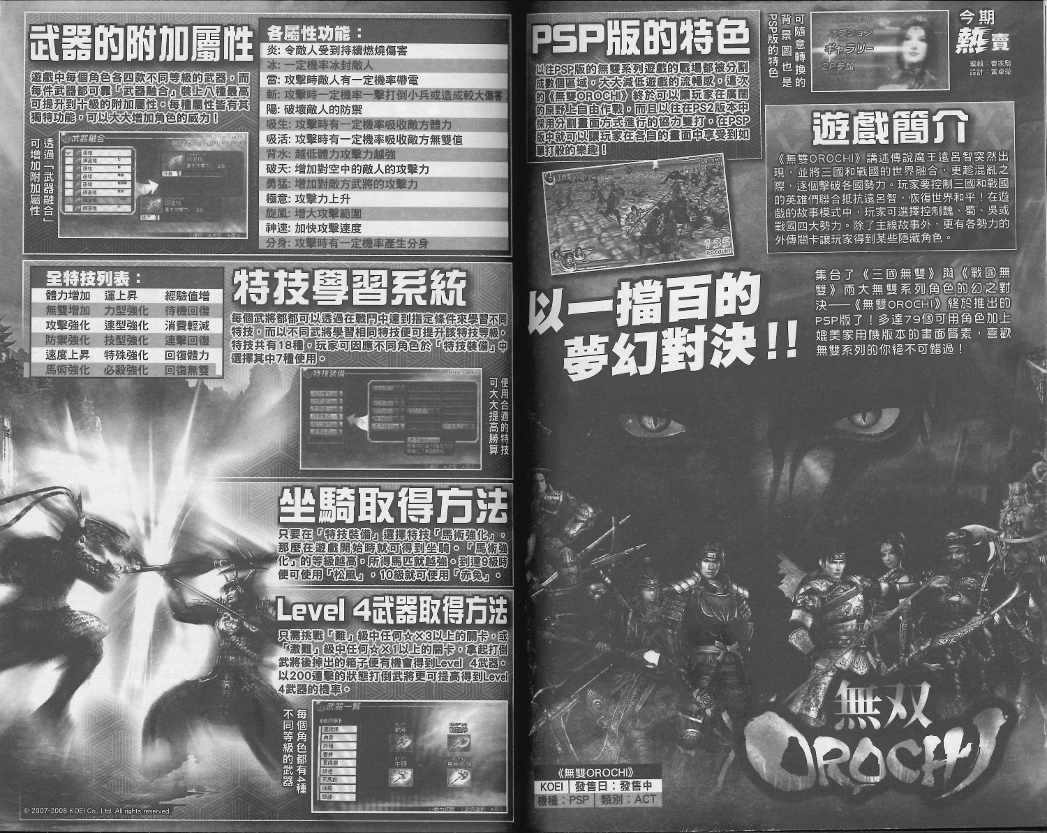 每期通常有兩至四版黑白版位,用來介紹新遊戲,這份《無雙OROCHI》PSP版不是我寫的,但記得之後為這個遊戲做過攻略稿。自己略為接觸過《真.三國無雙》,對那種「9撳」式遊戲,勉強可以接受,可是《無雙OROCHI》實在太破格,角色都像有超能力一樣飛來飛去,誇張度太高,很難投入。不過為了撰寫稿件,只好勉為其難爆機。相信不少Game書編輯也有這些痛苦回憶吧。