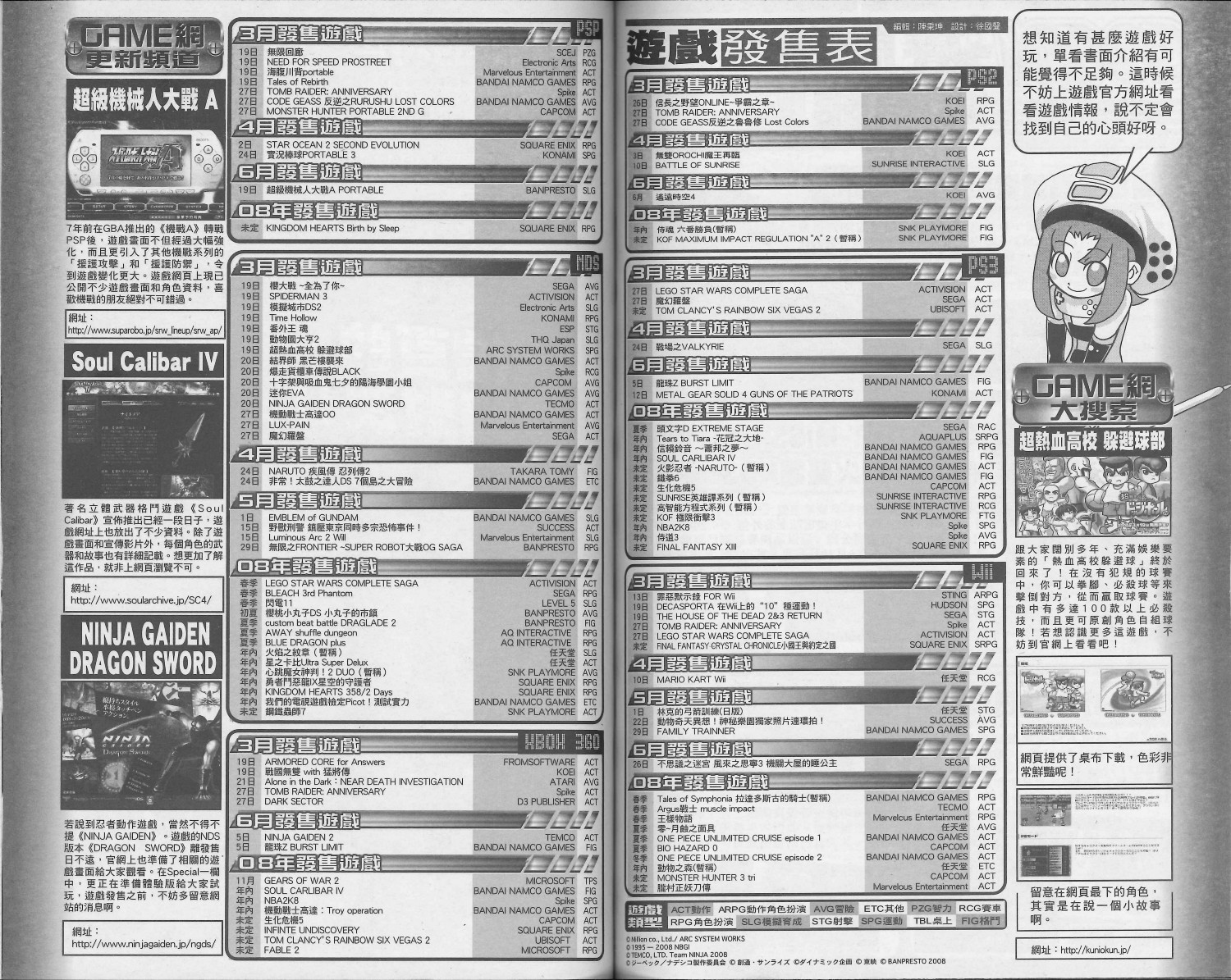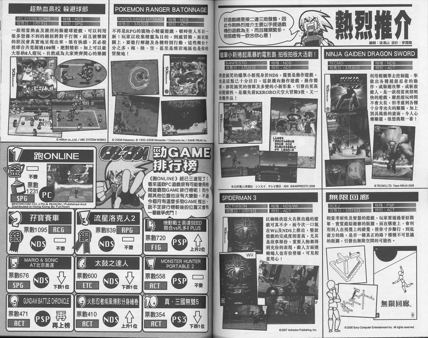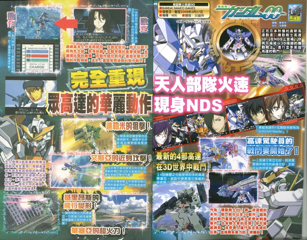 假如有些遊戲,跟一直介紹開的玩具品牌有聯動,就會在版頭彩頁的部分,作獨立介紹,順便為品牌作宣傳。由於是彩色的關係,搶眼程度當然比黑白版面高很多。最常見的有《龍珠》、《NARUTO》、《高達》這一類熱門作品。好像下面這篇,就介紹了《Gundam 00》的NDS遊戲。記憶中我也為了寫攻略稿,而打爆了這隻遊戲。