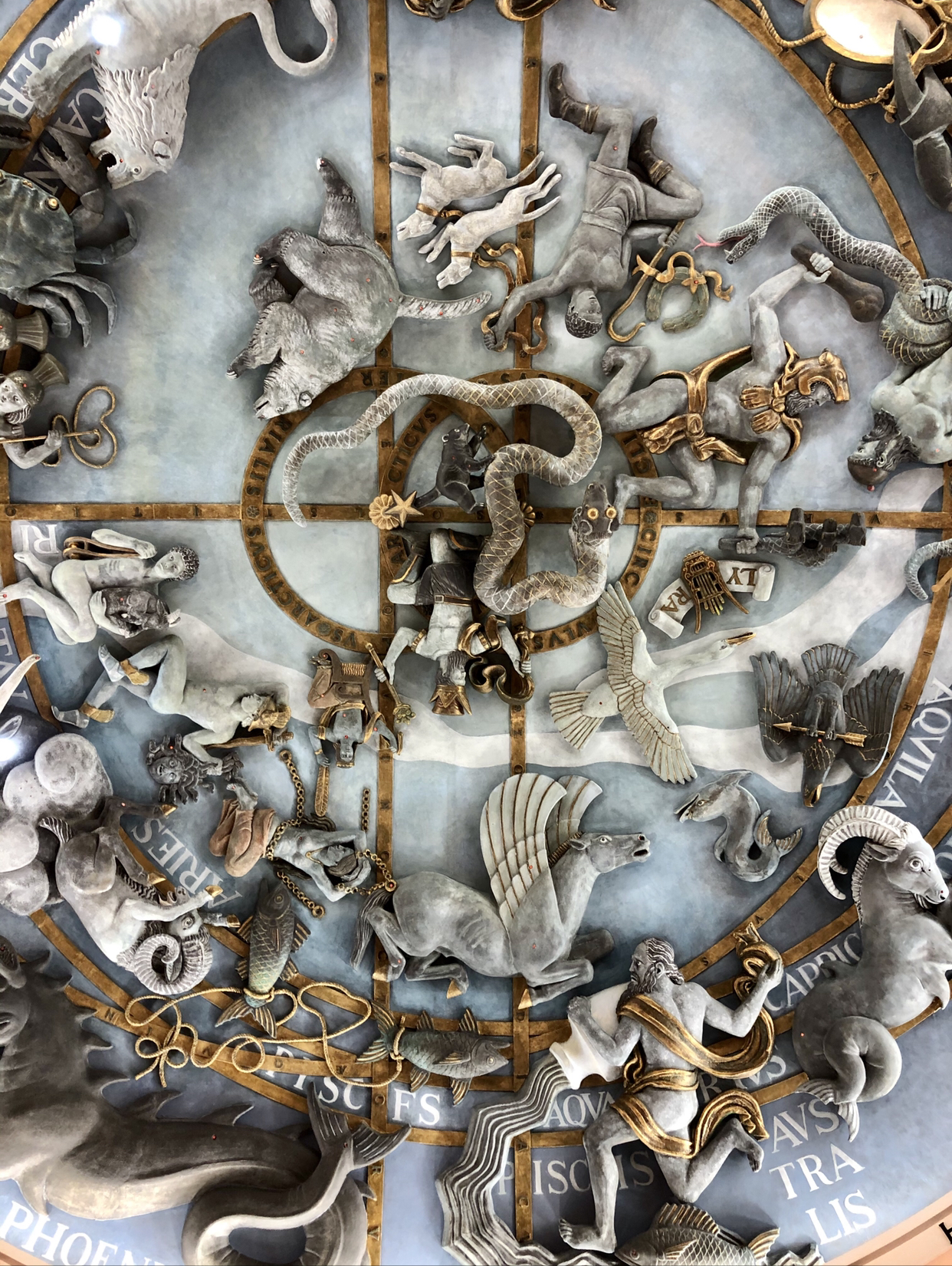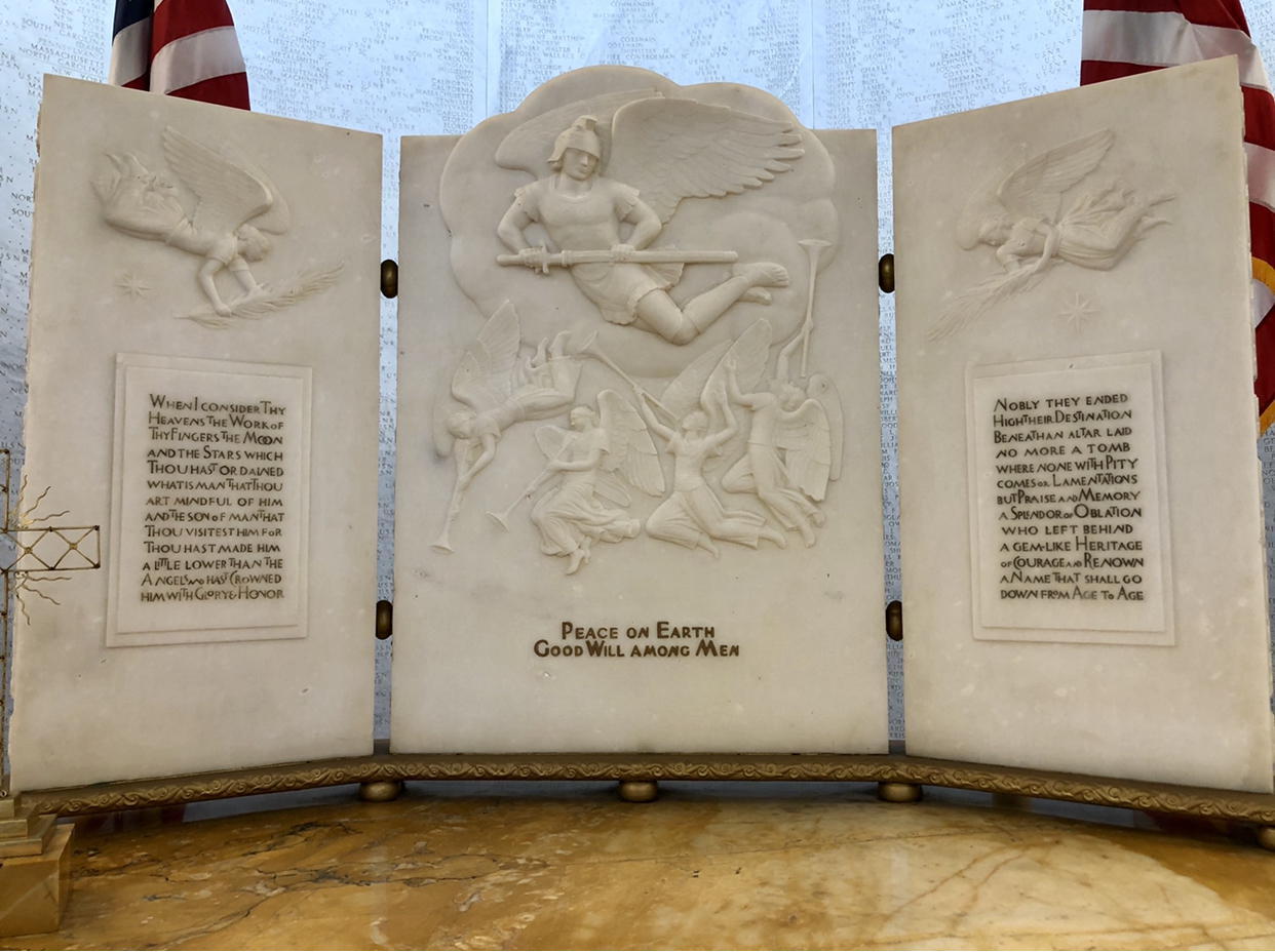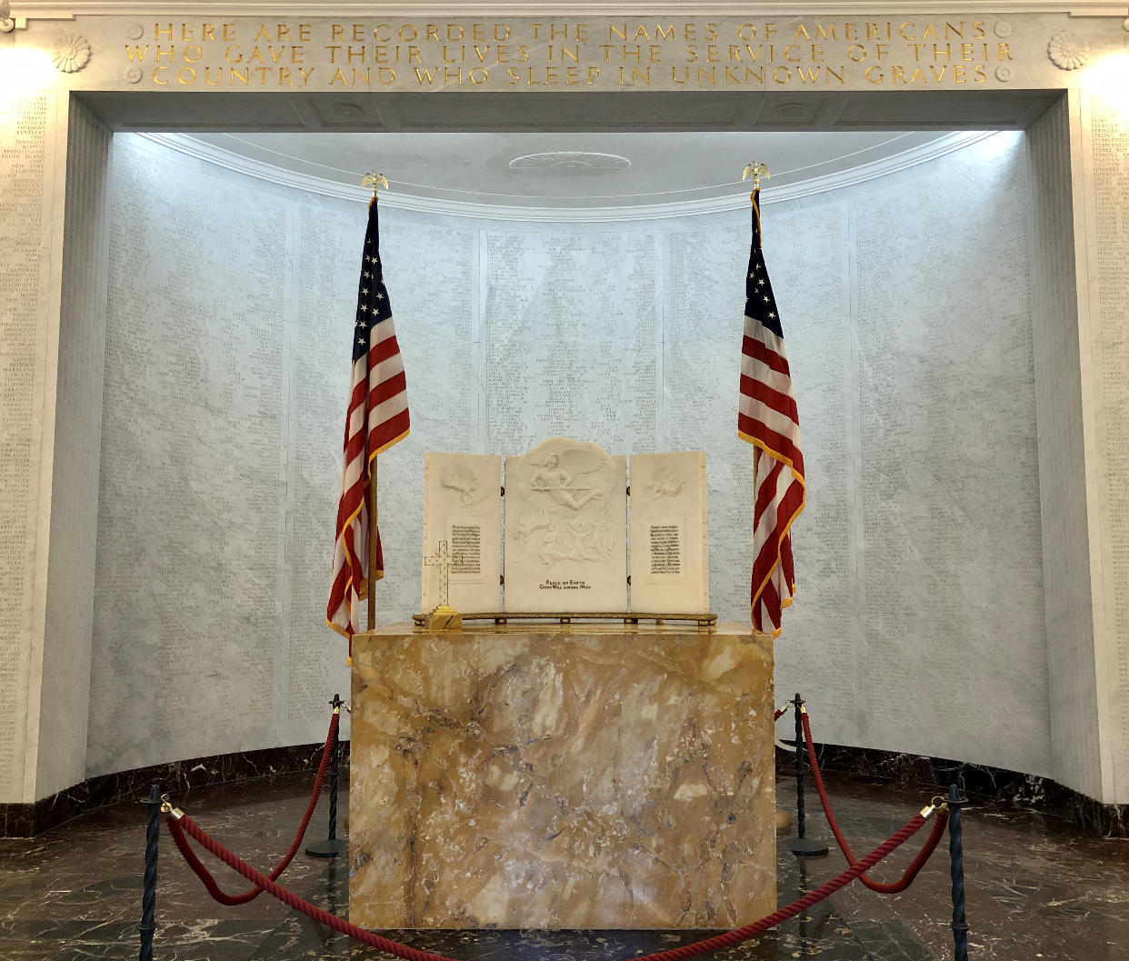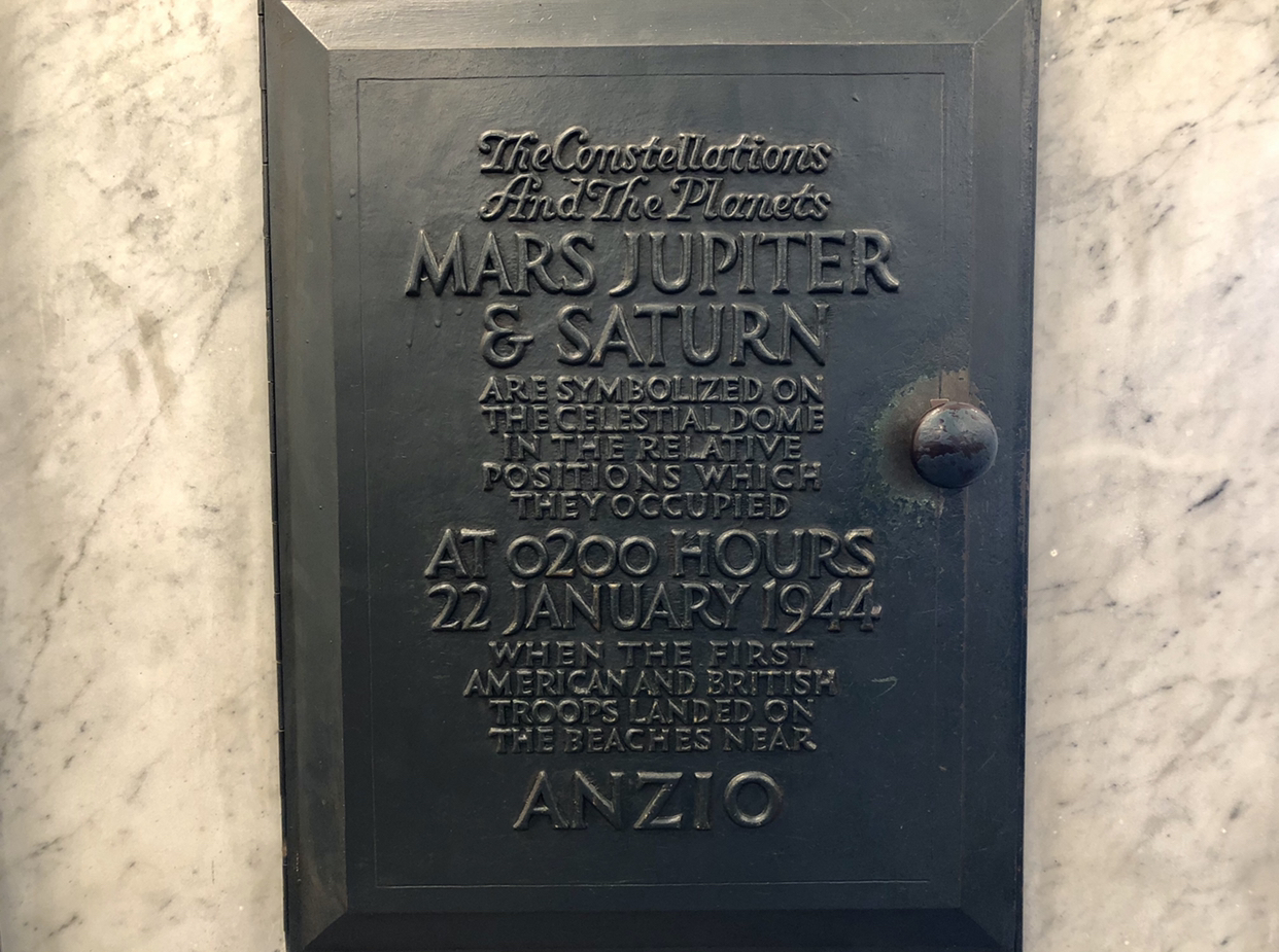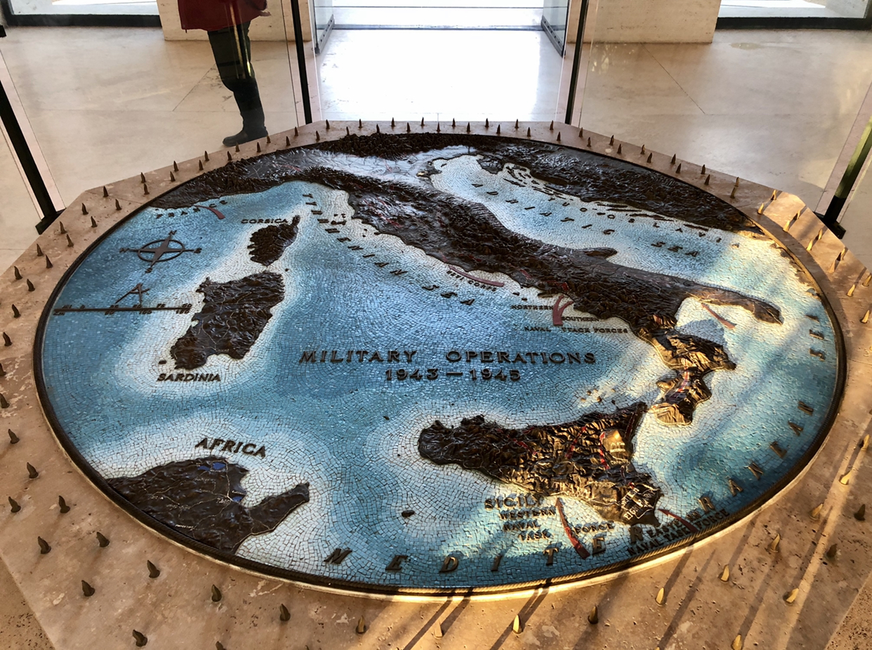 As you walk inside, you’re first drawn to the American flags standing on the either side of the passage inscribed marble. On the ground is a map of Italy and surrounding territory once occupied by German forces. Immediately following the picture of the map is looking directly at the ceiling—a giant piece of art featuring men, women, snakes, birds, and all kinds of different animals.