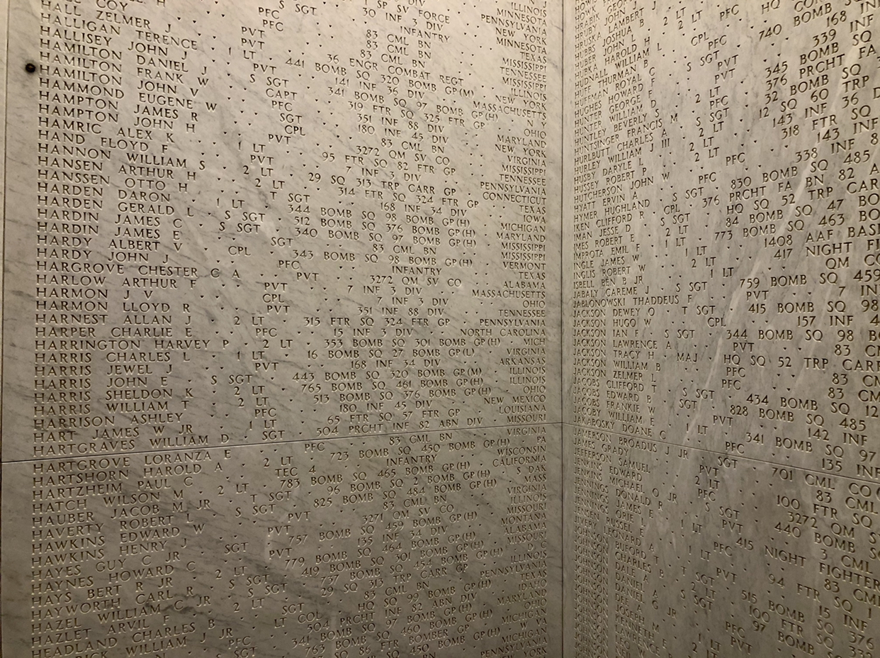 The wall behind the flags and each of the surrounding walls, four in total, are marble and have the names of each fallen American soldier, their rank, date and location they were killed during World War II inscribed on them—seven thousand, eight hundred and fifty eight. As you exit the monument, prior to the remaining rows of memorial sites leaving the cemetery, are finely groomed hedges with Stars and Stripes shaped into them and a fountain at the far end.