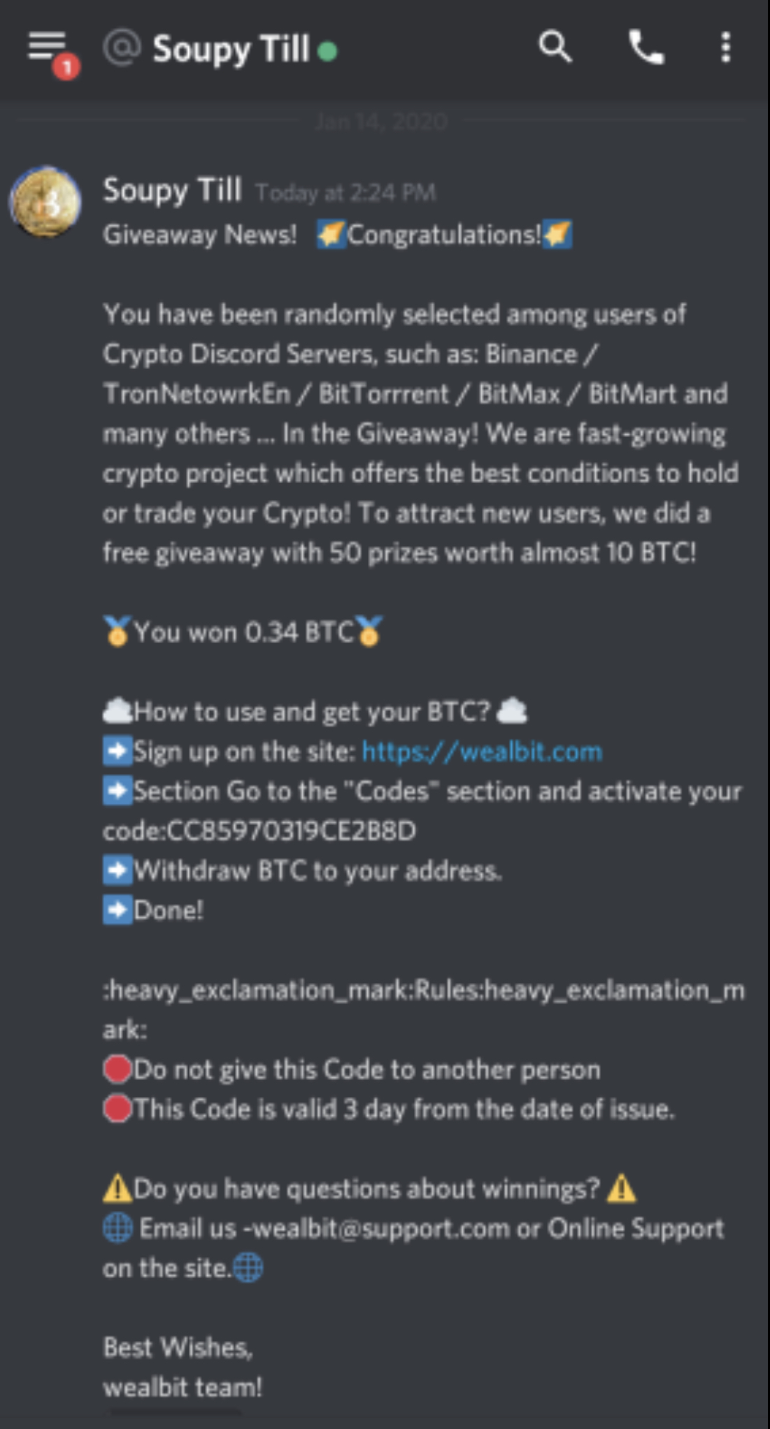 Good looking out and detective work Watson. Hopefully people will see this and keep their funds safe but never open and click on links in unsolicited messages. Ever.