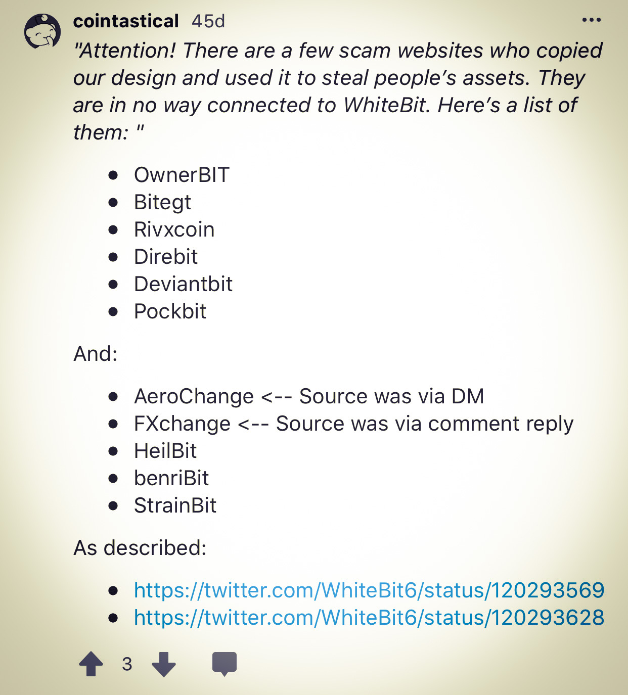 If you go to https://Pleinbit.com and see their coin offerings, you’ll notice you can’t scroll top to bottom through their listings—because the platform is a fraud. It’s a fraudulent exchange with an internal Bitcoin wallet developed to steal Bitcoin from those who are none the wiser. I wanted to know how they did it. That’s when I discovered the following thread with attached links to their Twitter account, explaining the scam in full detail, written by cointastical—one of the developers behind the exchange called “WhiteBit,” https://WhiteBit.com, an actual #crypto exchange: