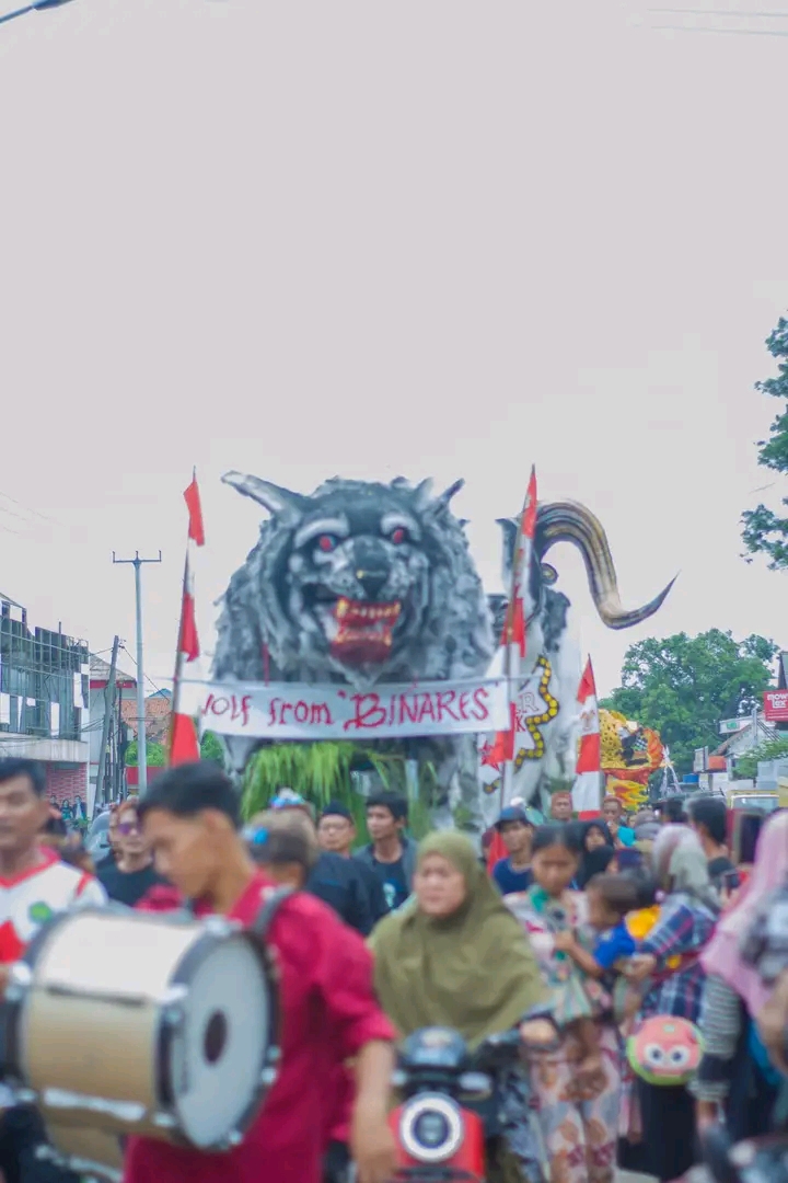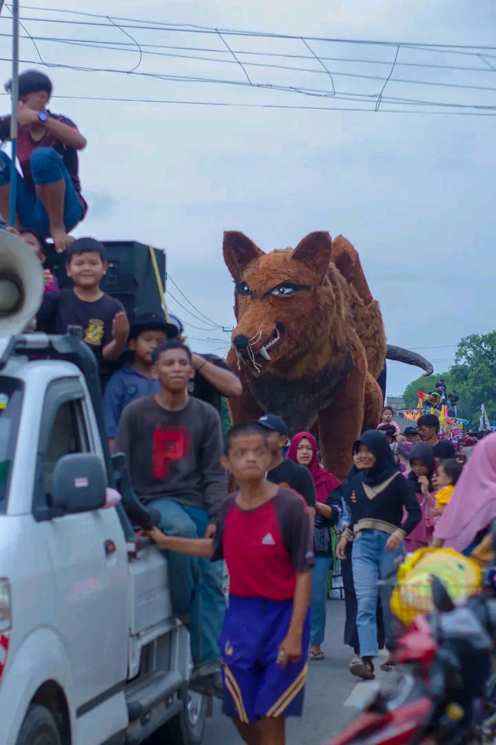 Kemeriahan pun diperlihatkan dengan dibuatkannya boneka raksasa hewan. Kerbau, tikus, serigala dan banyak yang lain diarak keliling desa.