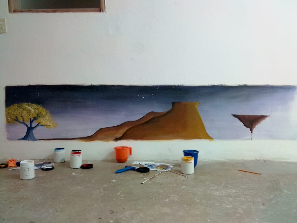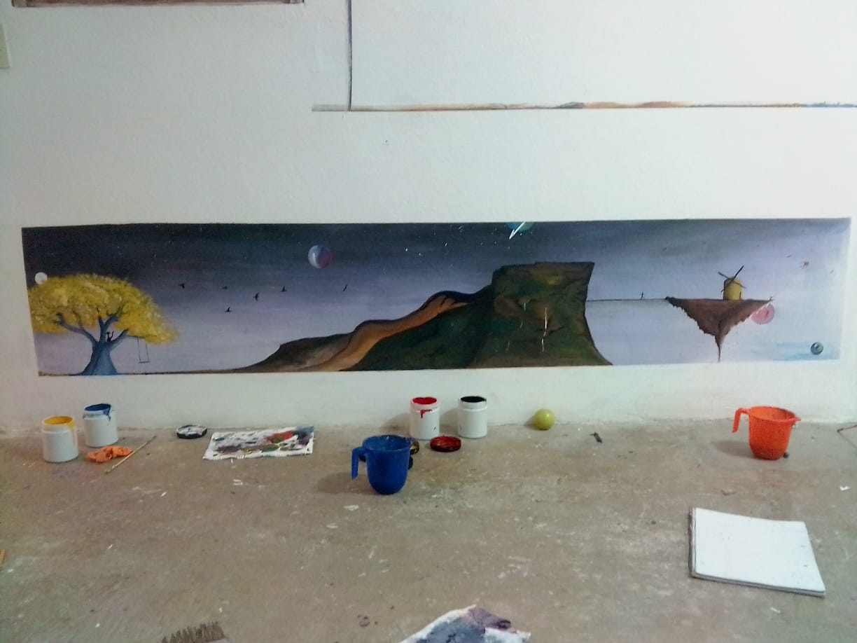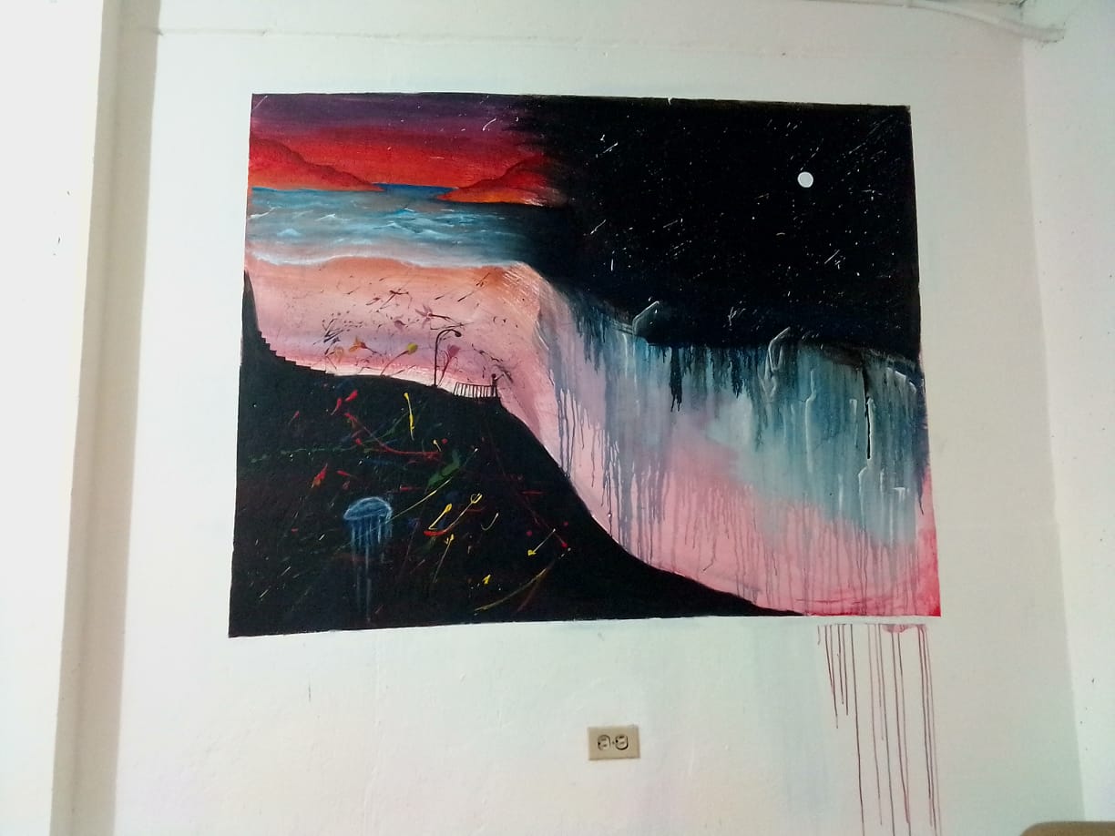 el camino termina siendo perfecto y me tope con un gran amigo viajero venezolano que rentaba una casita en BELLO, una linda montaña a las afueras del centro de Medellín, me dijo: "tengo un cuarto donde te puedes quedar", cuando llegué, al día siguiente él me dice: " me voy dos semanas a España, te puedes quedar aquí a cambio de unos murales" y me dejo pintura acrílica de color amarillo, azul, rojo blanco y negro.