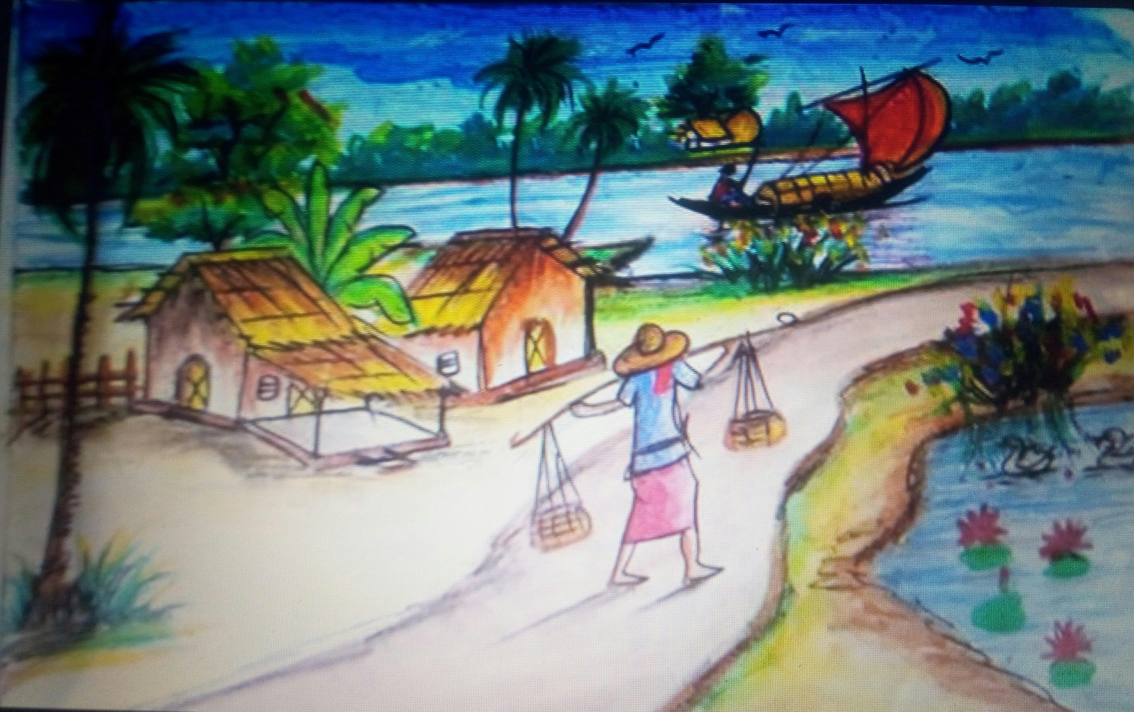 A man with his stuffs going through the village road to the boat, the boat is the only way to get to the market so village people can go to the market for selling their stuffs and earn money to survive. their demand is so few, they are happy to have a few what can just make them survive a day. less expectation less pain. so they always can stay happy because they don't have over expectation