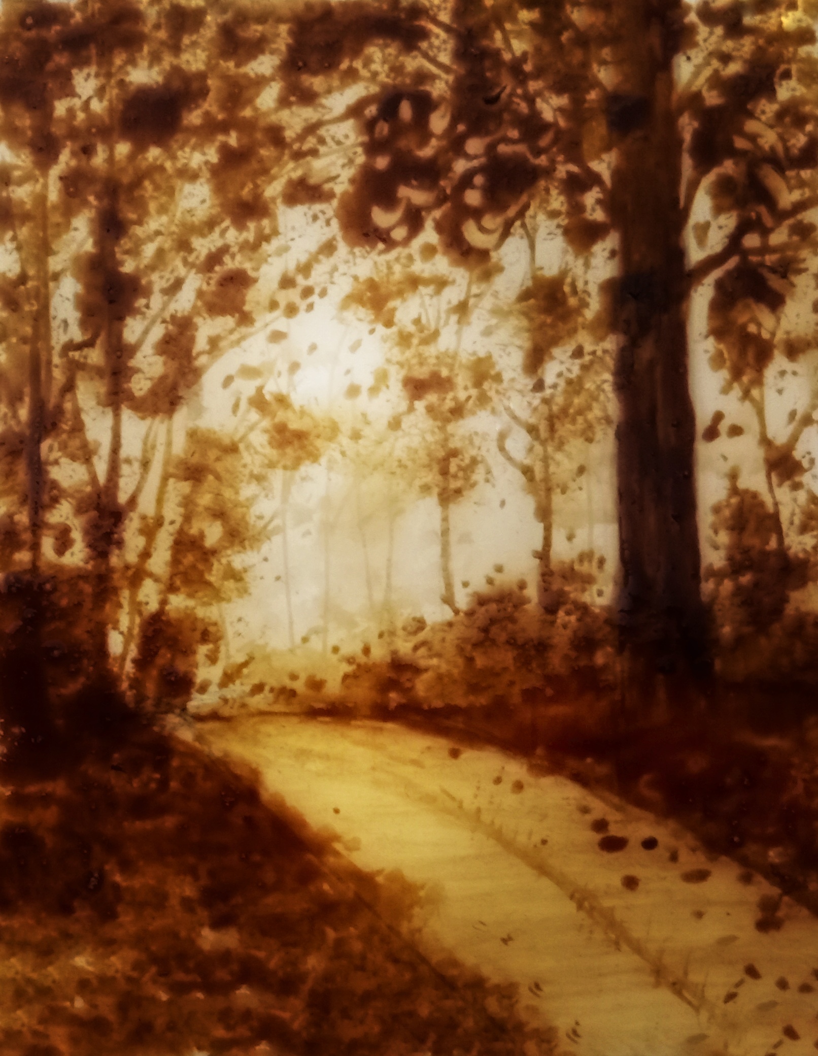 The artwork presents a coffee-toned forest landscape, This composition highlights a pathway leading into the depths of the forest, The interplay of light and shadow adds depth to the scene.
