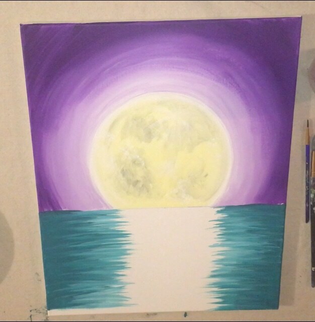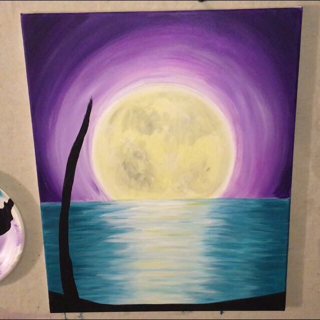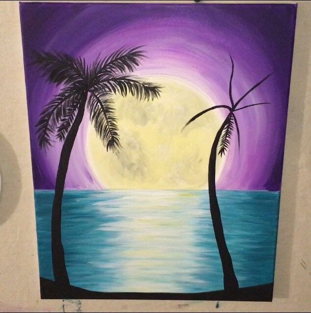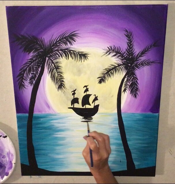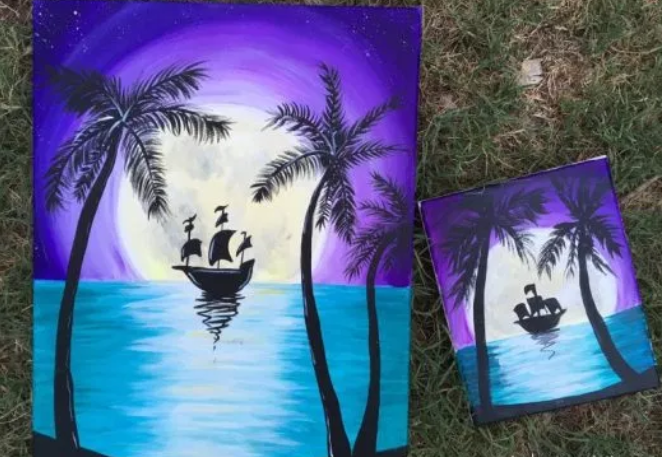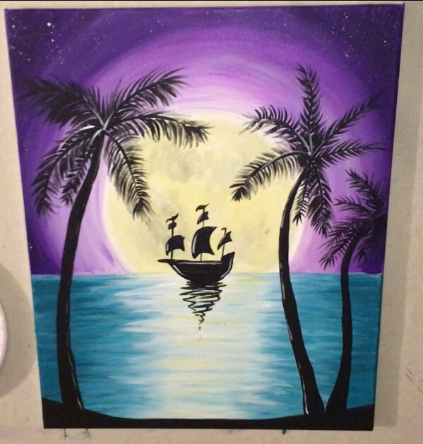 it’s an easy one with a limited color palette! a full moon, There is a silhouette of a Pirate Ship along the moon’s horizon radiating purple night sky, turquoise ocean and silhouette palm trees. 🎨🎨
