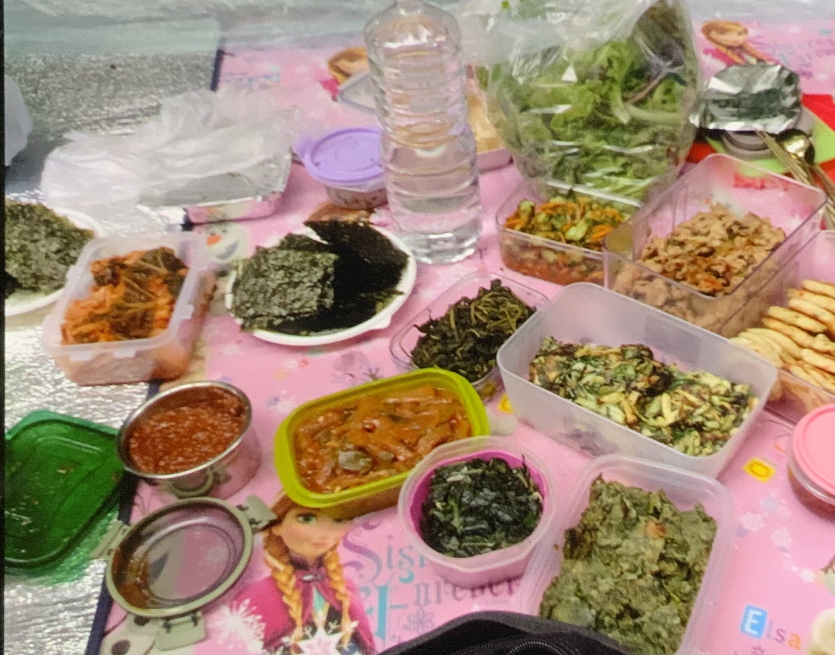 야외에서 각자 싸온 도시락을 나누어 먹으니