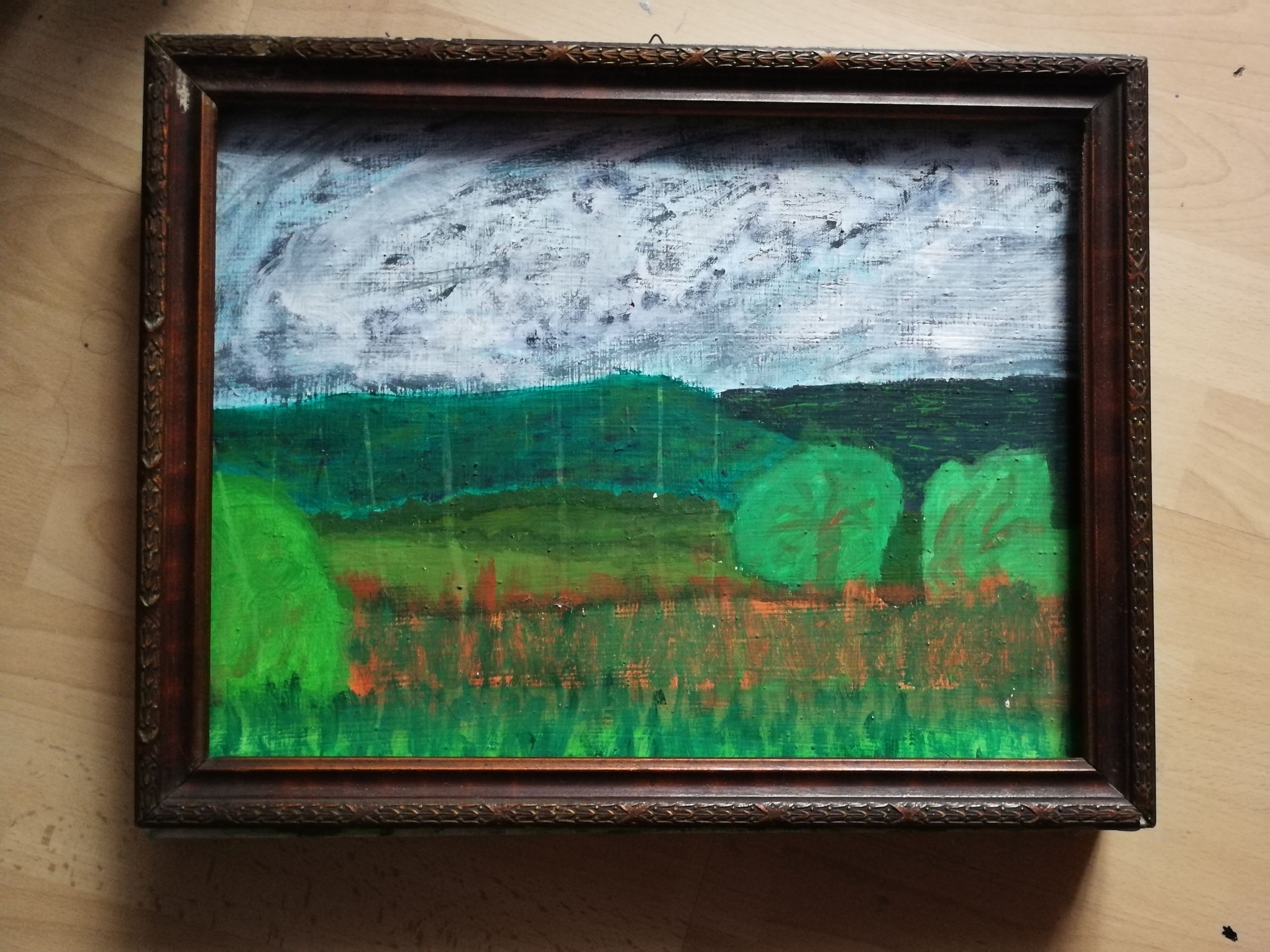 I was used acrylic paints, as far as I remember. It depicts Polish landscape, that I was immortalized in a photo during one of the trips.