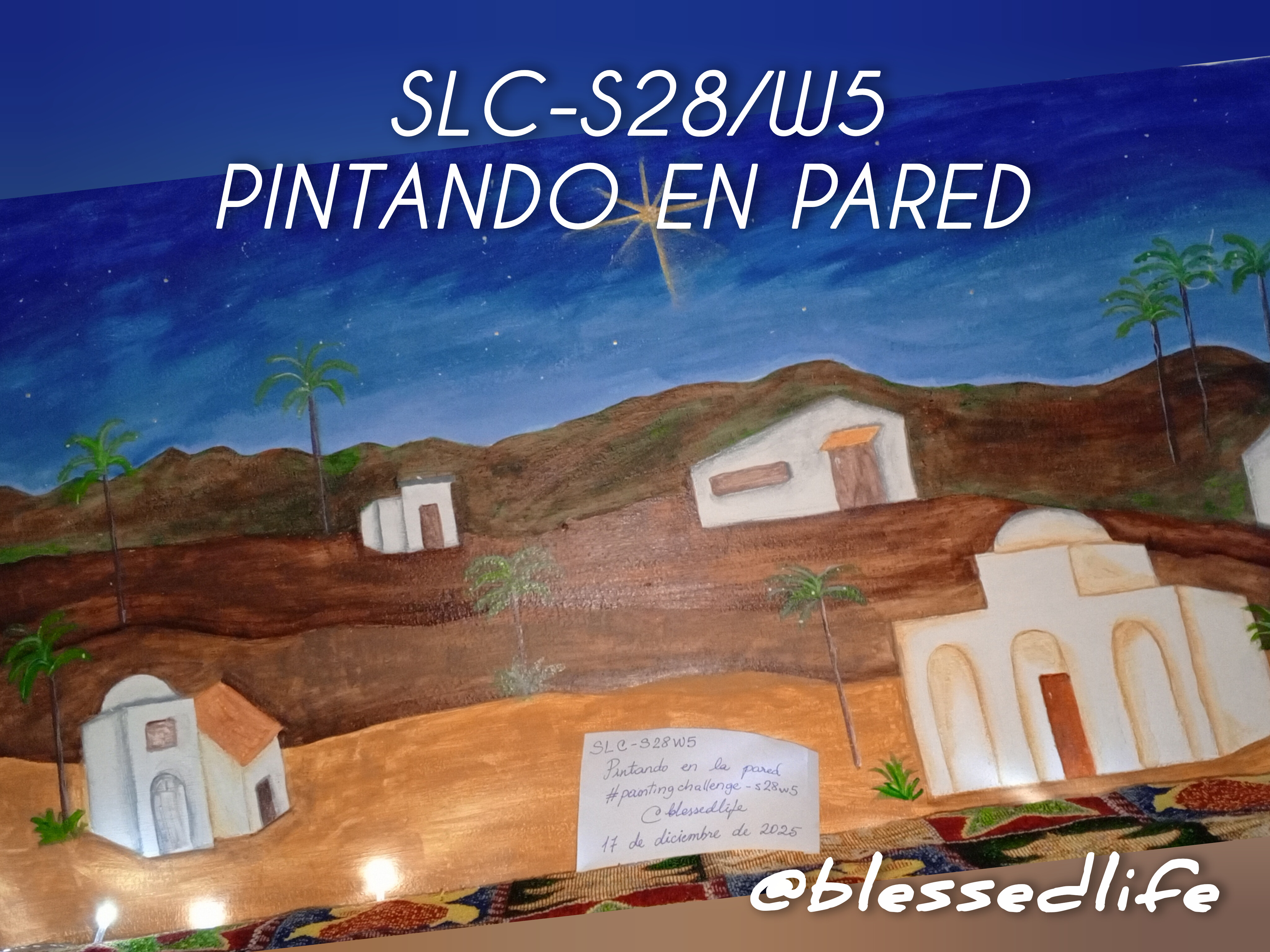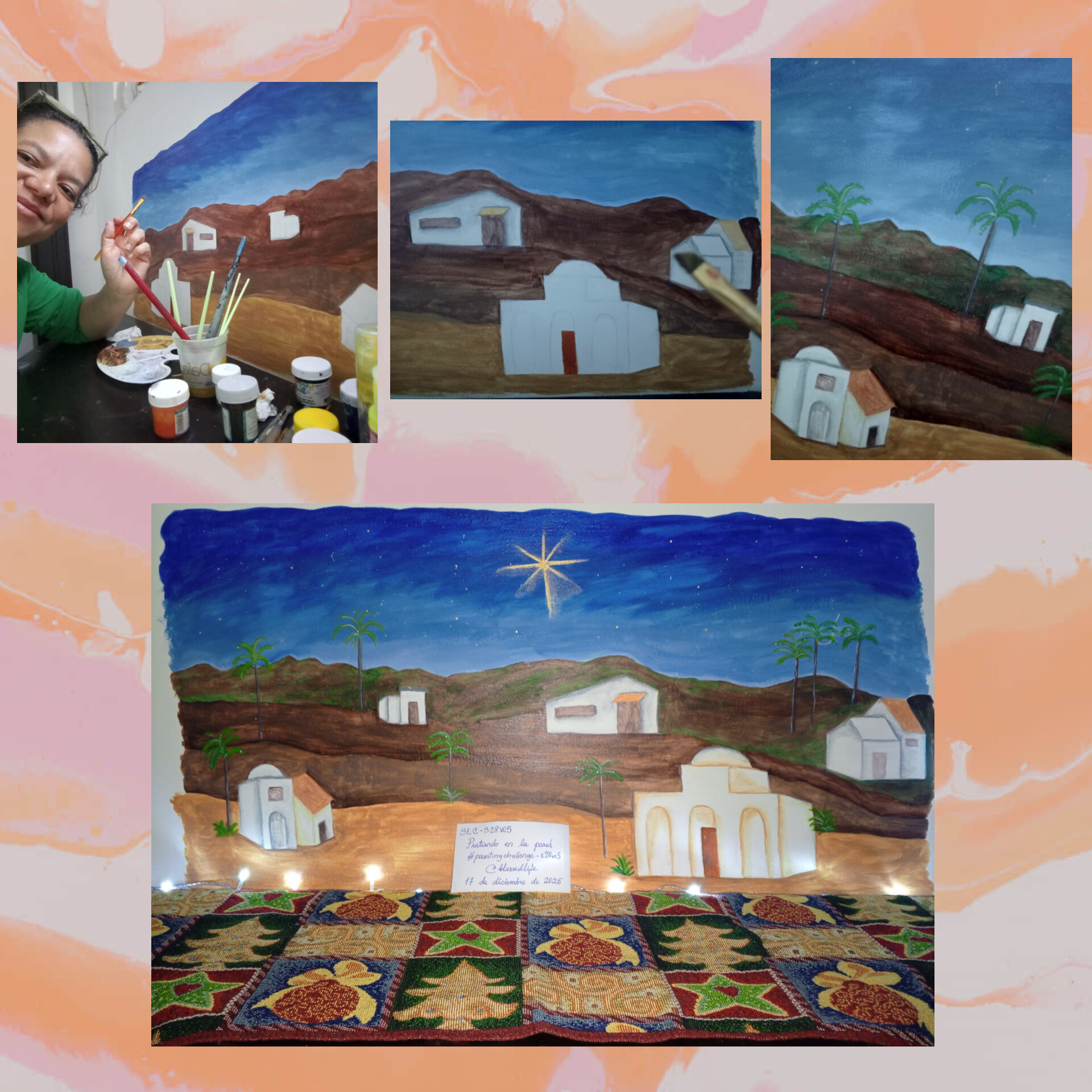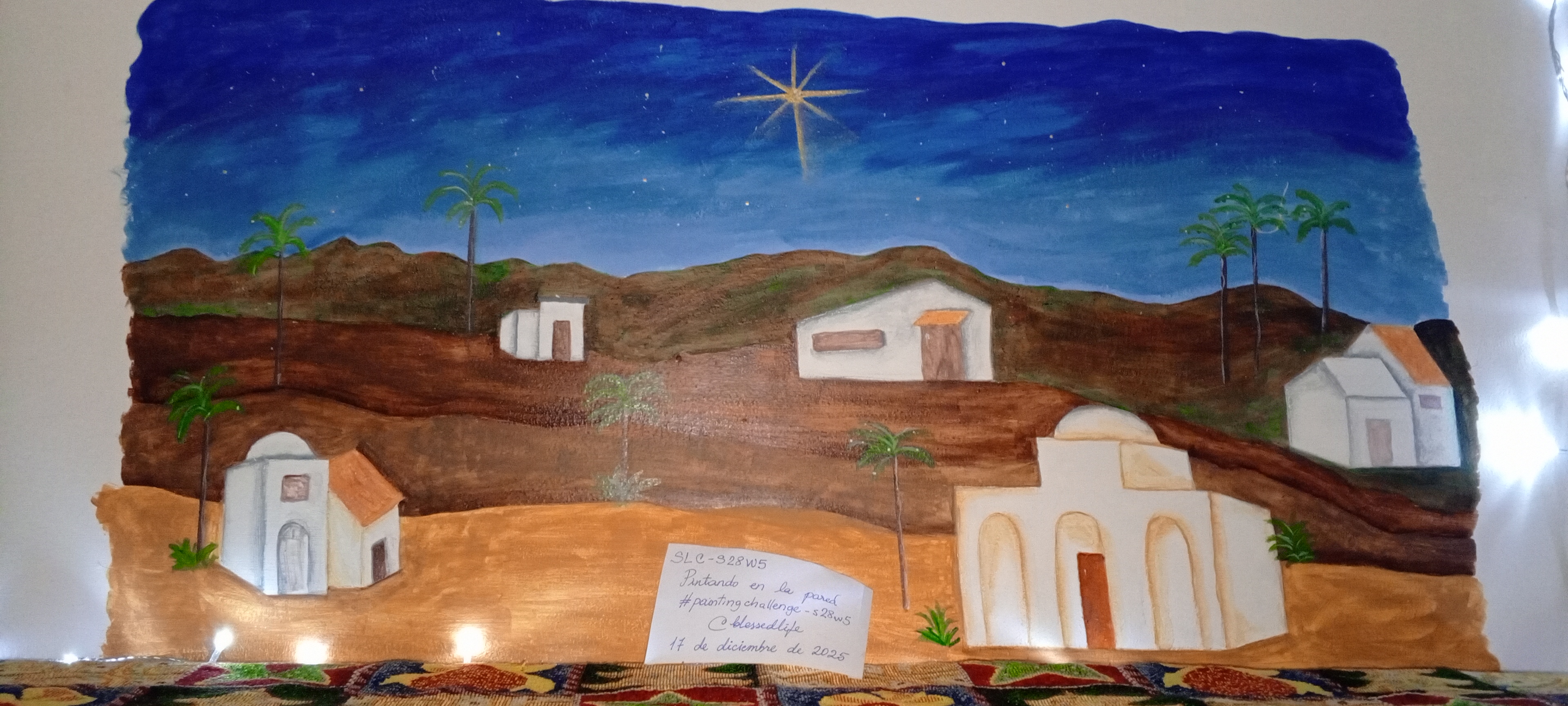Estas son las tareas a completar: En mi país tenemos la tradición de representar a través de pesebres el nacimiento del Niño Dios, ejemplo que tomamos de San Francisco de Asís. En los hogares se suele hacer con una combinación de artículos hechos de forma artesanal y figuras que se consiguen en los comercios. Todo esto requiere de un fondo, los comerciantes también ofrecen estos paisajes y afiches de la ciudad de Belén, hacer mi propio fondo fue mi motivación para pintar en la pared. Escogí colocar mi pesebre sobre una consola, ubicada a la entrada de mi casa. Retoqué la pared con pintura blanca a base de agua y aunque no estaba completamente lisa quedó lista como superficie para pintar (debí lijarla un poco con una lija fina, sin embargo cierta textura también tiene su encanto). 🖌️ El primer paso fue trazar unas guías del horizonte y los niveles de las montañas, el suelo, el cielo. 🖌️ Luego tracé algunas viviendas, distribuidas por todo el espacio. 🖌️ Una vez que tuve configurado el paisaje, dispuse de las pinturas y pinceles para iniciar el trabajo de darle color. Solo necesité adquirir una nueva pintura al frío para asegurar la base de color del cielo. 🖌️ A continuación comencé a dar color a los sectores del dibujo. 🖌️ Seguidamente me dediqué a los detalles que realzan las formas de las viviendas, añadí salpicado de color blanco y dorado en el cielo, un poco de vegetación y la Estrella de Belén. Estuve haciendo memoria y no es la primera vez que pinto sobre una pared. Hace muchos años, en mi colegio realizamos un mural con mensaje ecologista, pero el trabajo fue en equipo y de grandes dimensiones, con pinturas a base de aceite. En esta ocasión era un trabajo en solitario, sentí algunas dificultades pues al realizar algunos trazos y al pintar en la pared es un lienzo que no puedes girar para tu comodidad. Me encanta, es una actividad que conlleva retos y es altamente relajante, me distrae enormemente pues la atención está en el trabajo que estás realizando y al final estás satisfecho de ver lo que has hecho. Aunque soy una persona muy crítica y perfeccionista siento que me quedó muy lindo el paisaje para nuestro pesebre. Invito a @marito74, @sol02 y @nexcis a participar