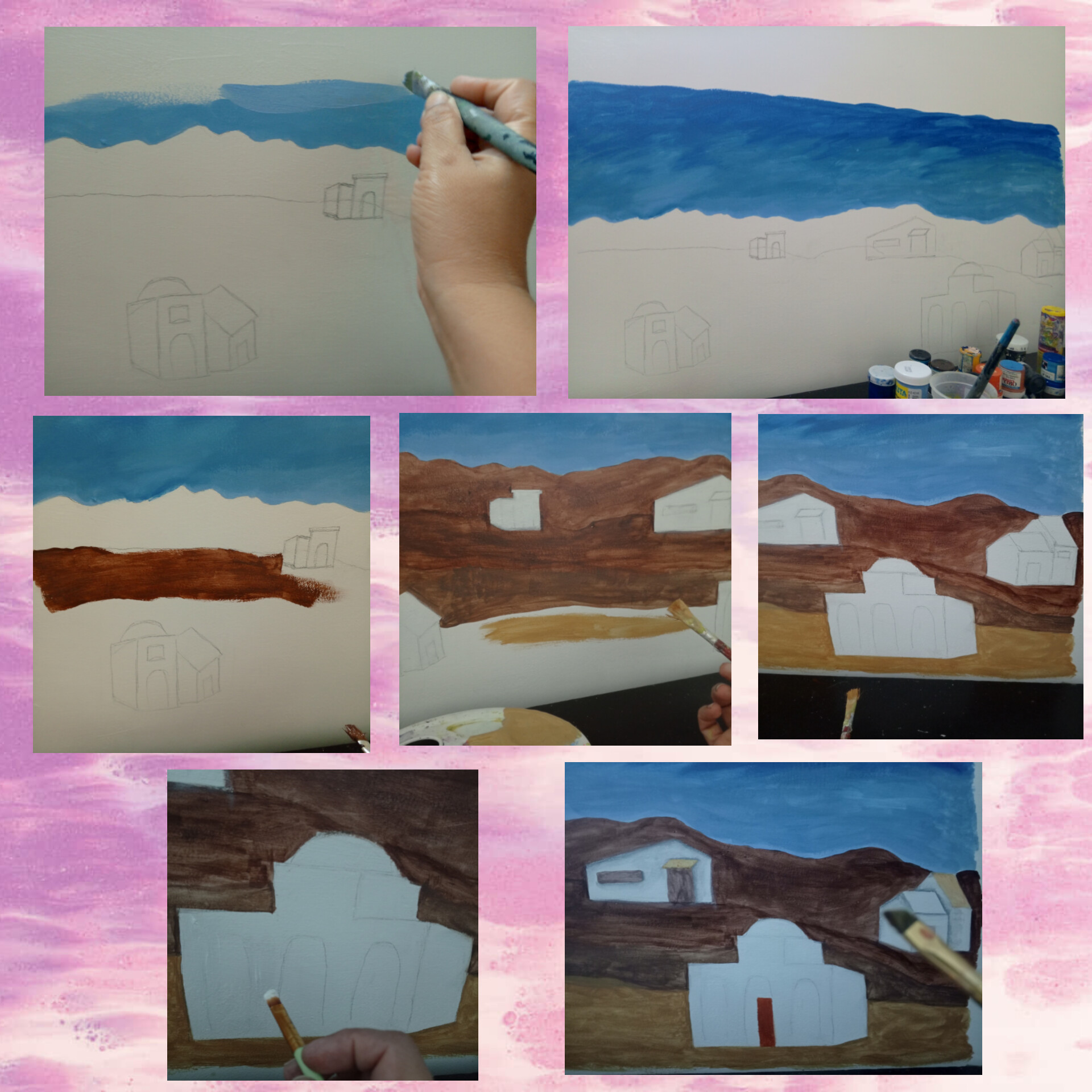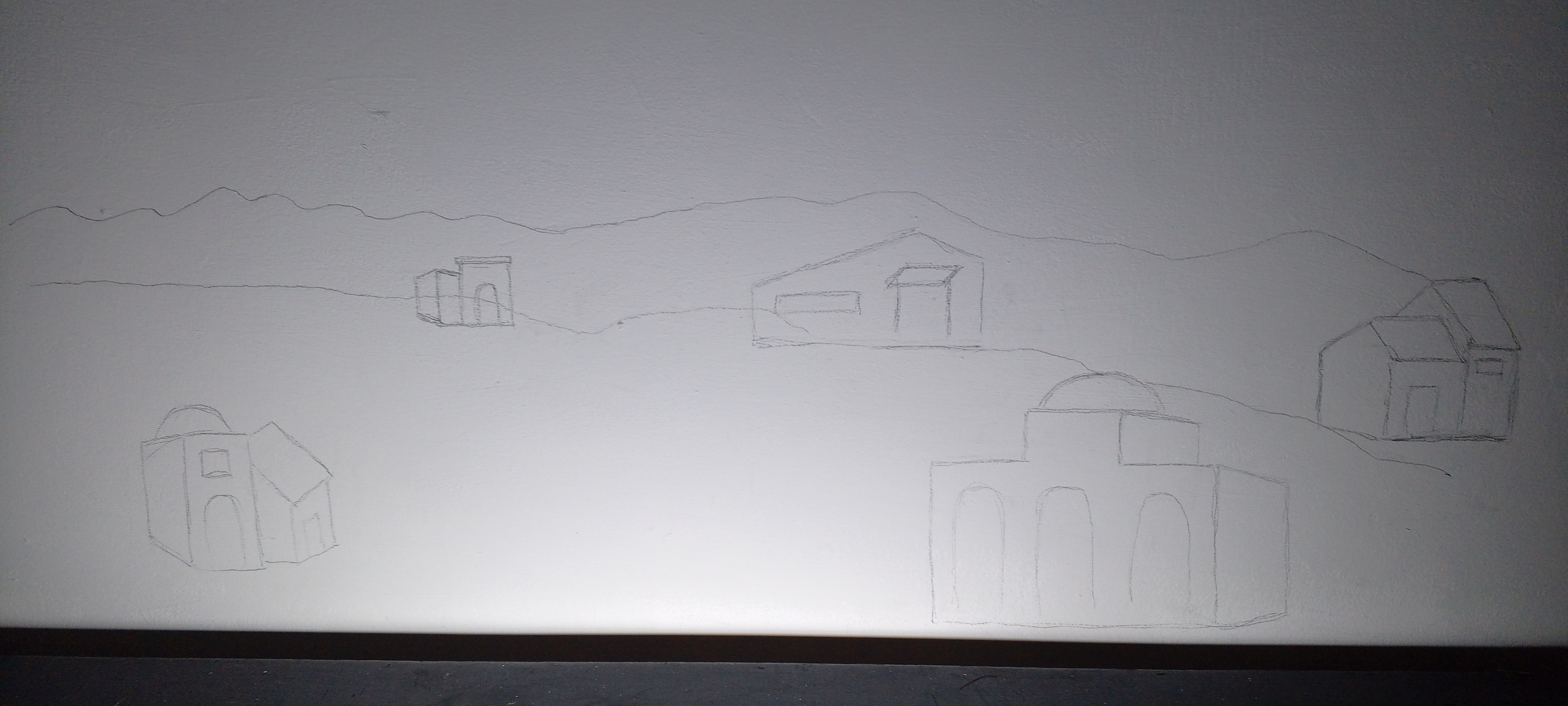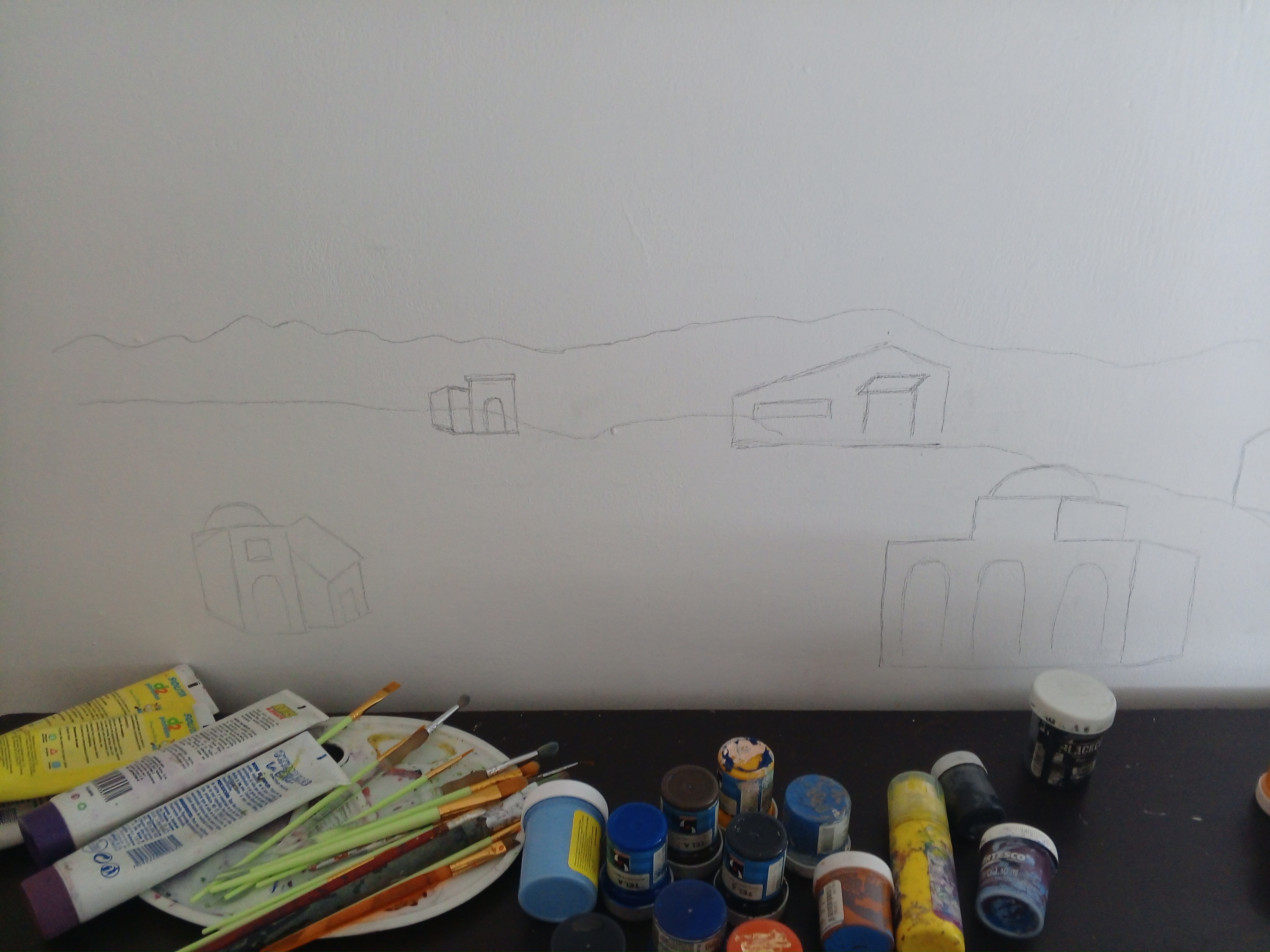 Estas son las tareas a completar: En mi país tenemos la tradición de representar a través de pesebres el nacimiento del Niño Dios, ejemplo que tomamos de San Francisco de Asís. En los hogares se suele hacer con una combinación de artículos hechos de forma artesanal y figuras que se consiguen en los comercios. Todo esto requiere de un fondo, los comerciantes también ofrecen estos paisajes y afiches de la ciudad de Belén, hacer mi propio fondo fue mi motivación para pintar en la pared. Escogí colocar mi pesebre sobre una consola, ubicada a la entrada de mi casa. Retoqué la pared con pintura blanca a base de agua y aunque no estaba completamente lisa quedó lista como superficie para pintar (debí lijarla un poco con una lija fina, sin embargo cierta textura también tiene su encanto). 🖌️ El primer paso fue trazar unas guías del horizonte y los niveles de las montañas, el suelo, el cielo. 🖌️ Luego tracé algunas viviendas, distribuidas por todo el espacio. 🖌️ Una vez que tuve configurado el paisaje, dispuse de las pinturas y pinceles para iniciar el trabajo de darle color. Solo necesité adquirir una nueva pintura al frío para asegurar la base de color del cielo. 🖌️ A continuación comencé a dar color a los sectores del dibujo. 🖌️ Seguidamente me dediqué a los detalles que realzan las formas de las viviendas, añadí salpicado de color blanco y dorado en el cielo, un poco de vegetación y la Estrella de Belén. Estuve haciendo memoria y no es la primera vez que pinto sobre una pared. Hace muchos años, en mi colegio realizamos un mural con mensaje ecologista, pero el trabajo fue en equipo y de grandes dimensiones, con pinturas a base de aceite. En esta ocasión era un trabajo en solitario, sentí algunas dificultades pues al realizar algunos trazos y al pintar en la pared es un lienzo que no puedes girar para tu comodidad. Me encanta, es una actividad que conlleva retos y es altamente relajante, me distrae enormemente pues la atención está en el trabajo que estás realizando y al final estás satisfecho de ver lo que has hecho. Aunque soy una persona muy crítica y perfeccionista siento que me quedó muy lindo el paisaje para nuestro pesebre. Invito a @marito74, @sol02 y @nexcis a participar