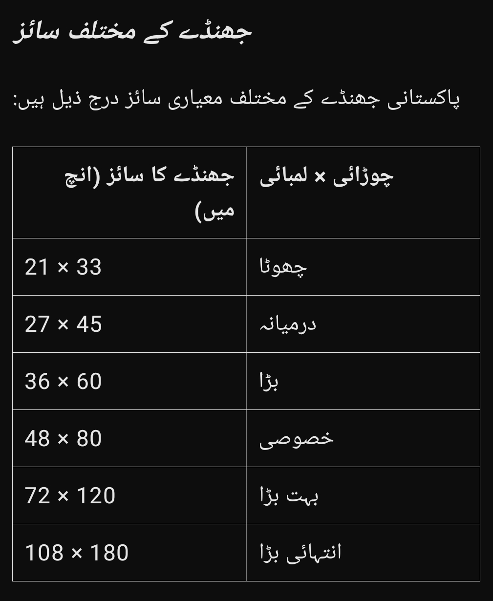 پاکستانی جھنڈے کے مختلف معیاری سائز درج ذیل ہیں: