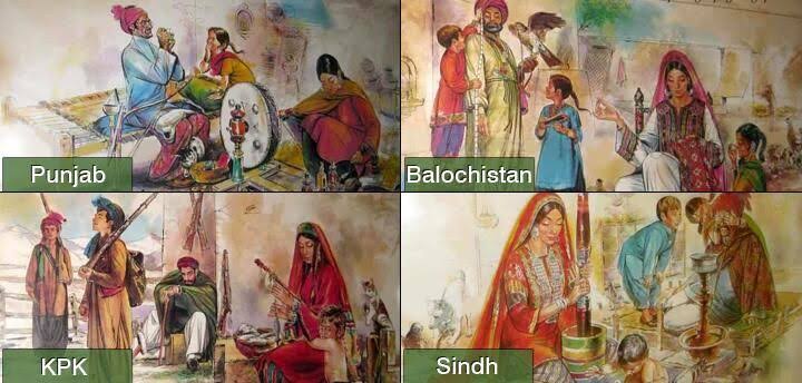 There are various elements of this culture. Pakistani clothes express the culture of Pakistan, the demographics of Pakistan and cultures from the Punjab, Sindh, Balochistan, Pashtun and Kashmir regions of the country. Dress in each regional culture reflect weather conditions, way of living and distinctive style which gives it a unique identity among all cultures. For example our Islamic traditions are very beautiful. Dupatta on head in front of all people of family and others is very respectful. Standing of the sitting position when an elder comes in that place . All these Islamic traditions are the beauty of our culture.