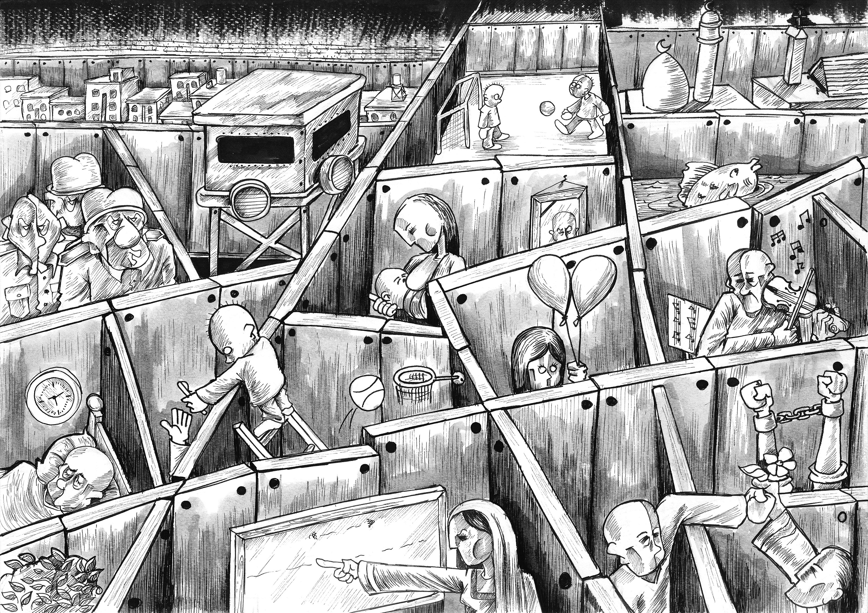 One of Sabaaneh’s cartoons, titled “Lives Interrupted,” portrays the restrictions experienced by Palestinians. It shows Palestinians living life in enclosed spaces with little prospect of communication or movement.