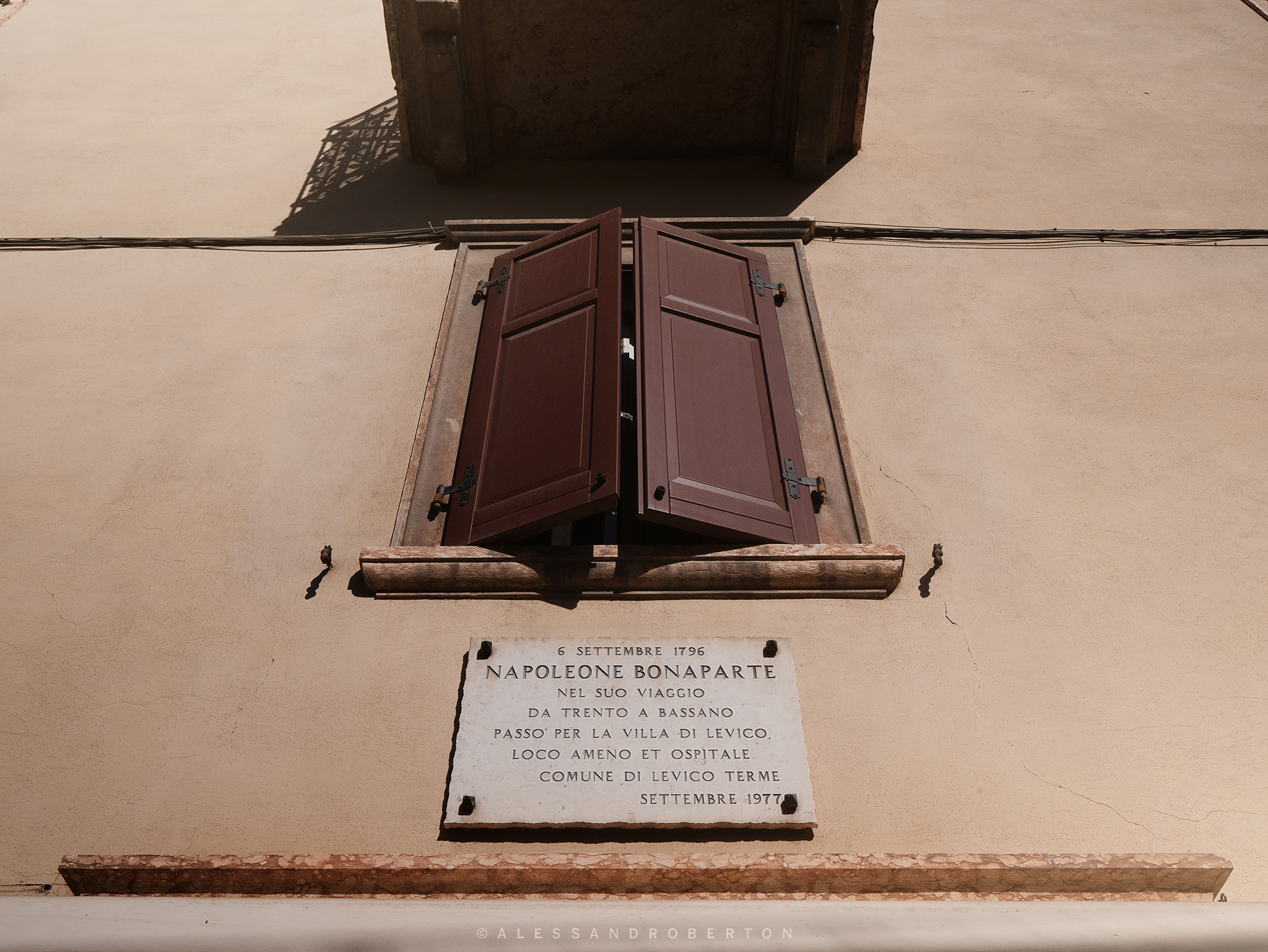 An effigy on a palace recalls that in 1796 Napoleon Bonaparte moved to Levico Terme.