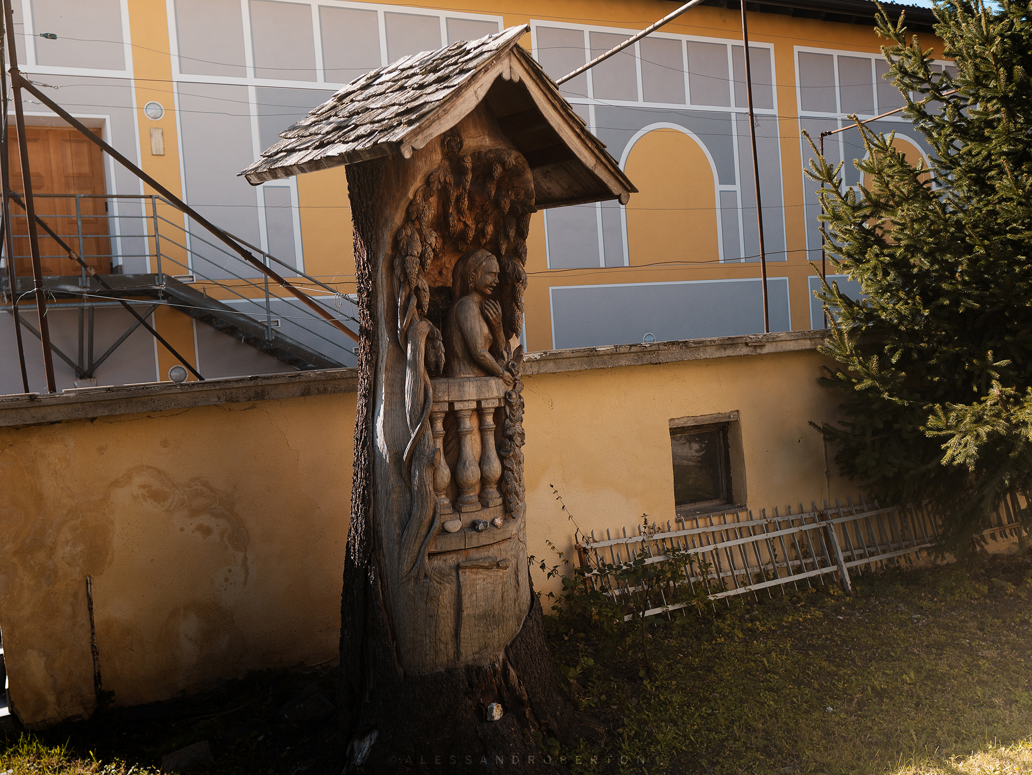 Proseguendo lungo la strada in discesa ho fotografato questa scultura in legno che era posizionata dentro un giardino privato.