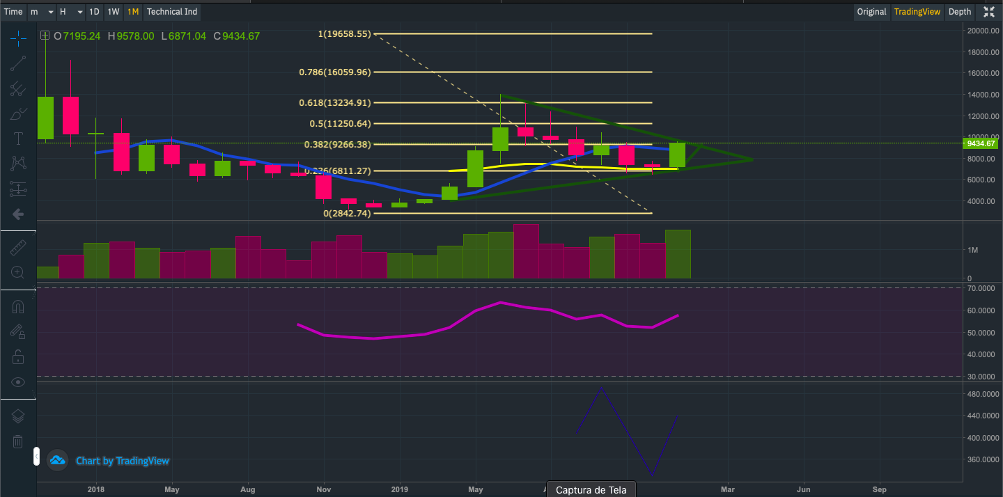 O próximo suporte (e também o mais forte) está na faixa dos USD$ 9.266,38 (Fibonnacci 0,382). Creio que estejamos caminhando para o próximo Fibonacci que se encontra em USD$ 11.250,64.