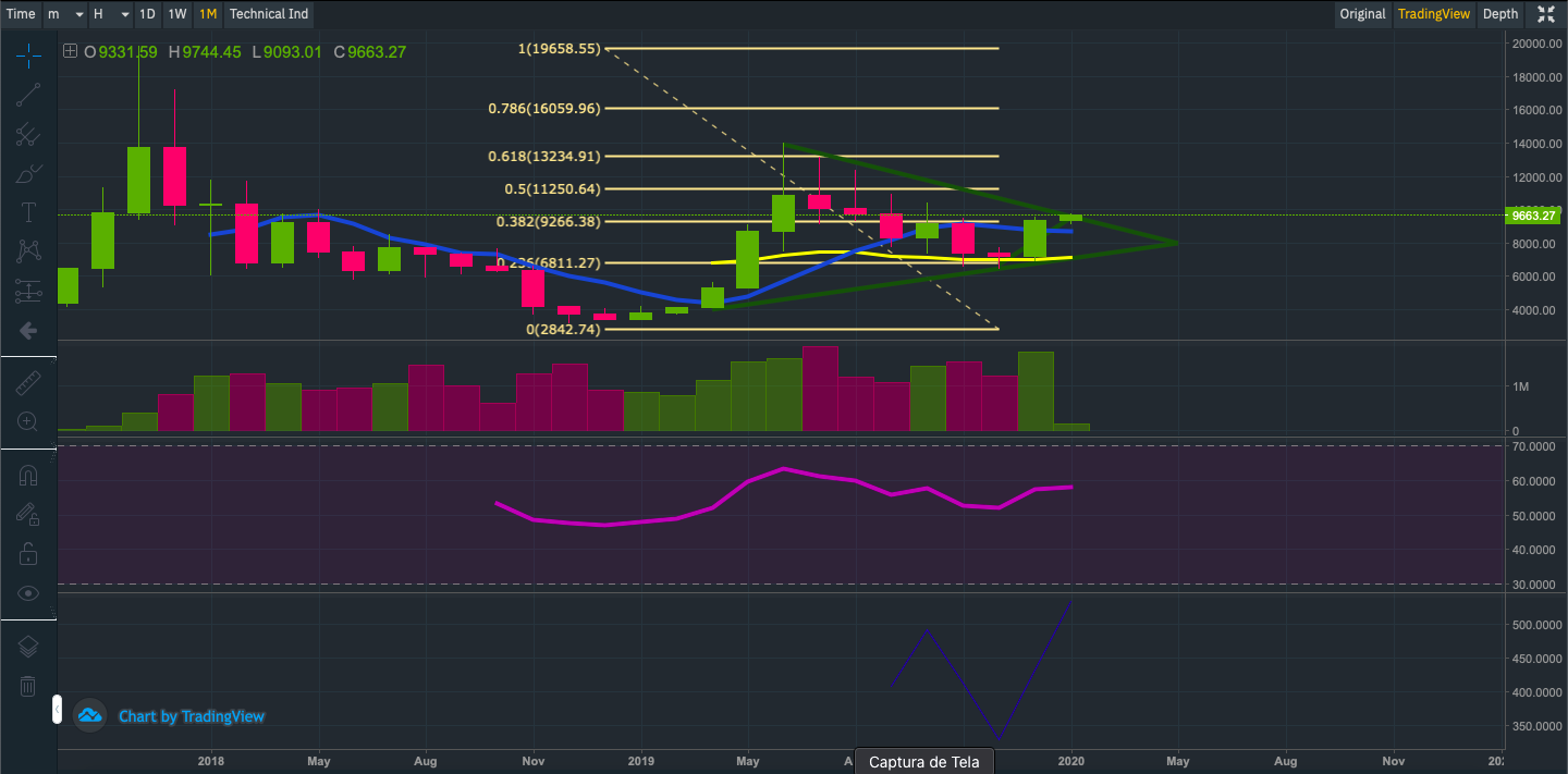 Cabe lembrar aqui que essas Fibonaccis foram traçadas levando-se em conta a máxima histórica dos preços do BTC (de USD$ 19.798,68) desde o dia 17/12/2017.