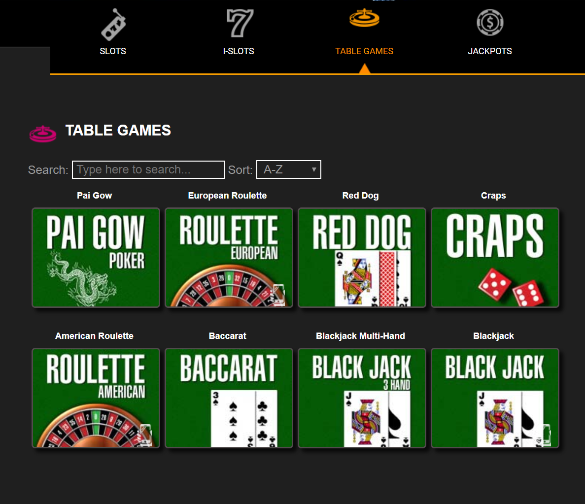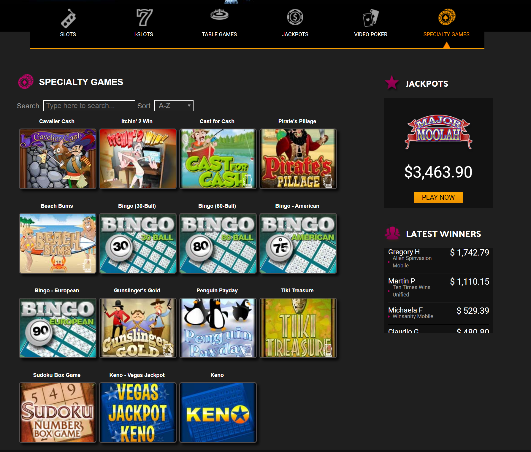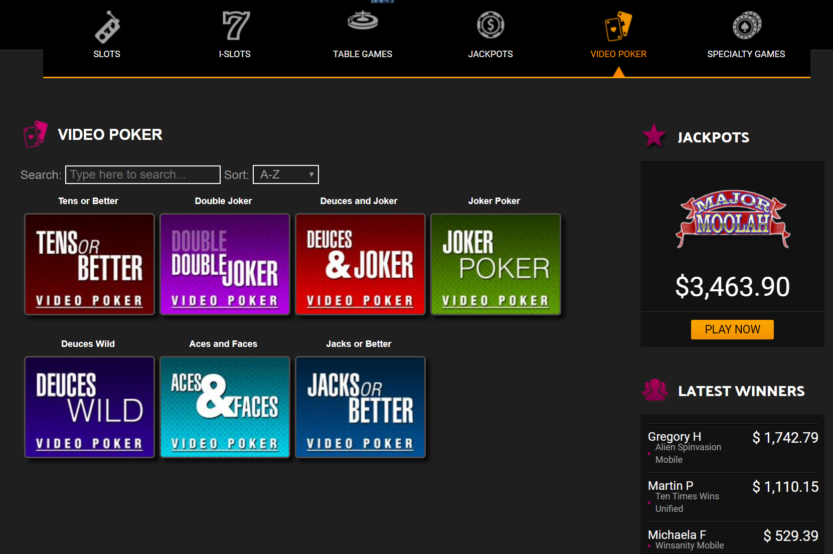 As any virtual casino in the desert should achieve, there are Slots, Table Games, Jackpots, Video Poker, and Specialty Games offered.