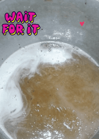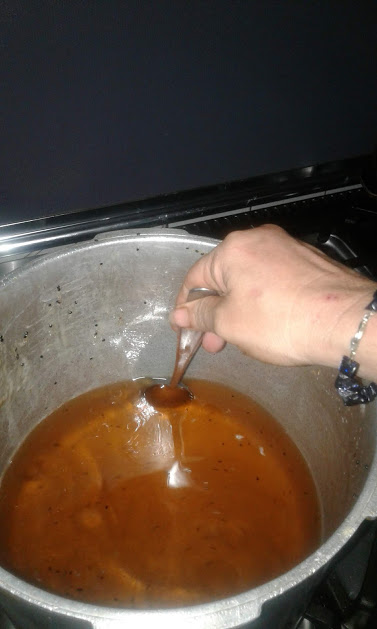 The mixture was brought to a boil stirring continuously until the sugar was dissolved, and from there on occasionally. As the mixture cooked the bubbles started forming a thick layer of white foam at the top, and this was continually scooped off as it build up so that the end product would be a clear jelly.