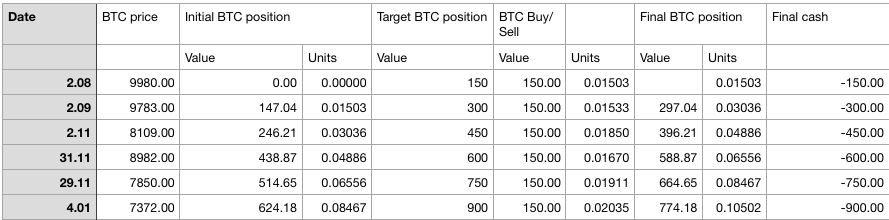Since I have started this in august the BTC price has only gone down so for the moment the rules force me to buy the full amount every month. In this case that means that I am averaging in every month. At some point the price will either go up and I will have to sell or the averaging down will be so big that I have to sell as well.