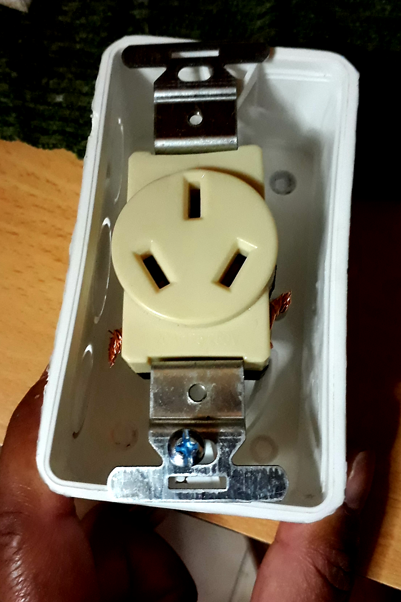 Conectar el enchufe hembra en el cajetín, para que haya mayor seguridad al momento de usarla, asegurándola con los tornillos.