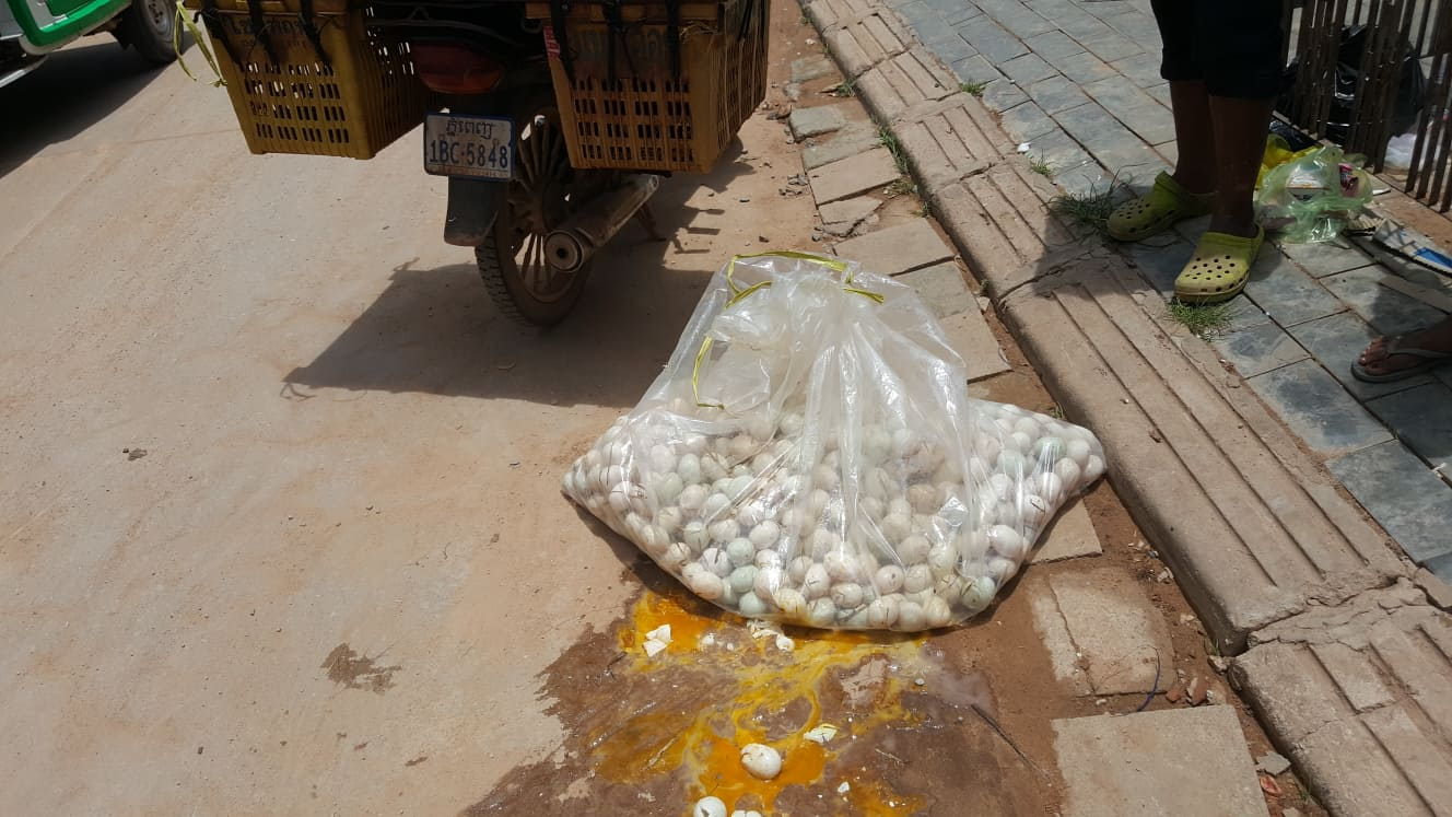 By the time we arrived negotiations had gone down to $67 US dollars for the price of broken eggs. We were told we could keep the remaining duck eggs in the bag also. Still expensive but a better solution then the first prices offered.