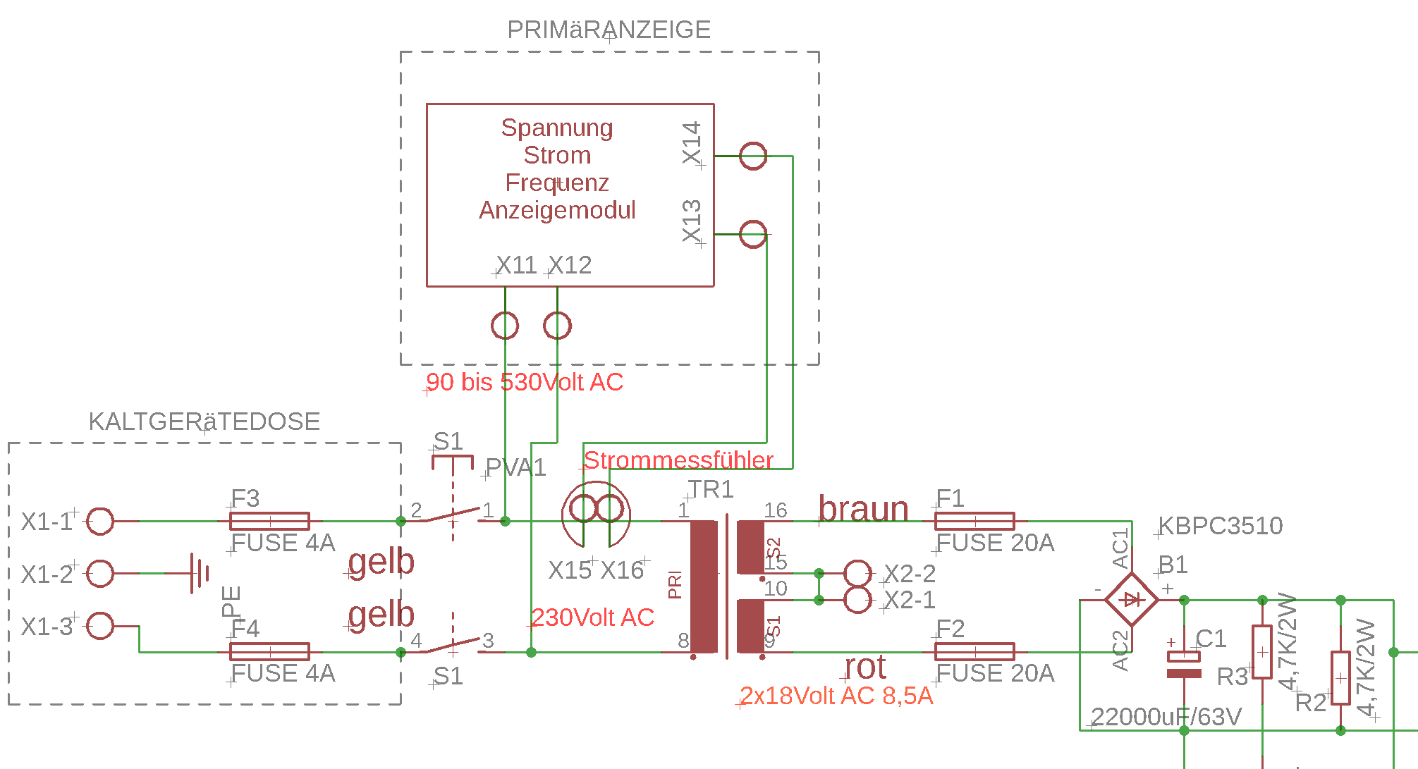 Jetzt ein Sicherheitshinweis: Wer sich im Umgang mit Netzspannung nicht auskennt sollte Arbeiten die mit Netzspannung zu tun haben dem Fachmann überlassen!! Alle Leitungen die mit Netzspannung zu tun haben, also alle Leitungen auf der Primärseite des Trafos, sind so auszuführen das ein berühren nicht möglich ist. Das bedeutet keine blanken Kontakte, bitte Schrumpfschlauch verwenden! Alle Gehäuseteile sind mit dem PE-Leiter zu verbinden. Das ist im Schaltplan der Kontakt X1-2.