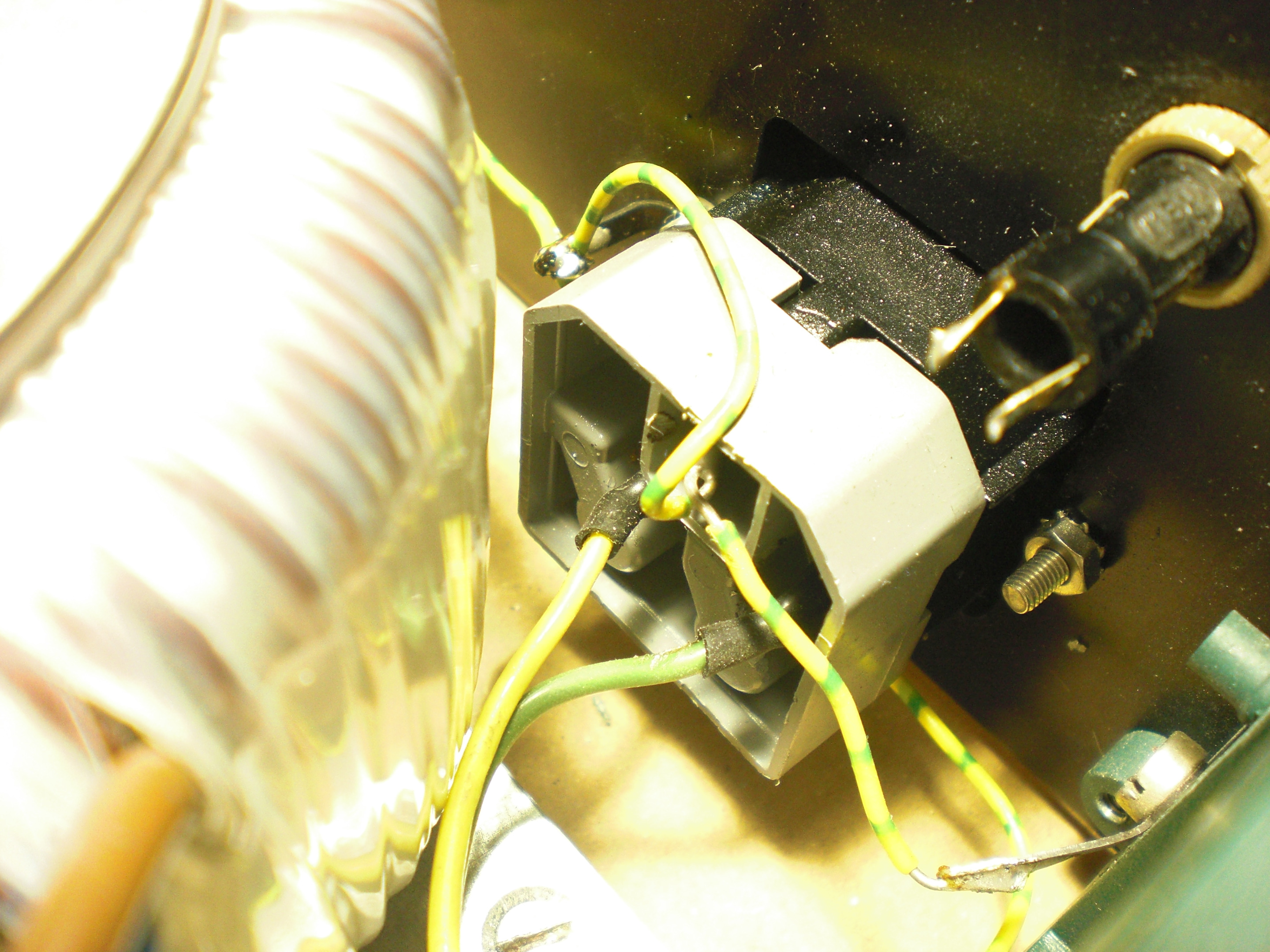 The IEC socket from the inside. The protective conductors yellow - green are clearly visible.