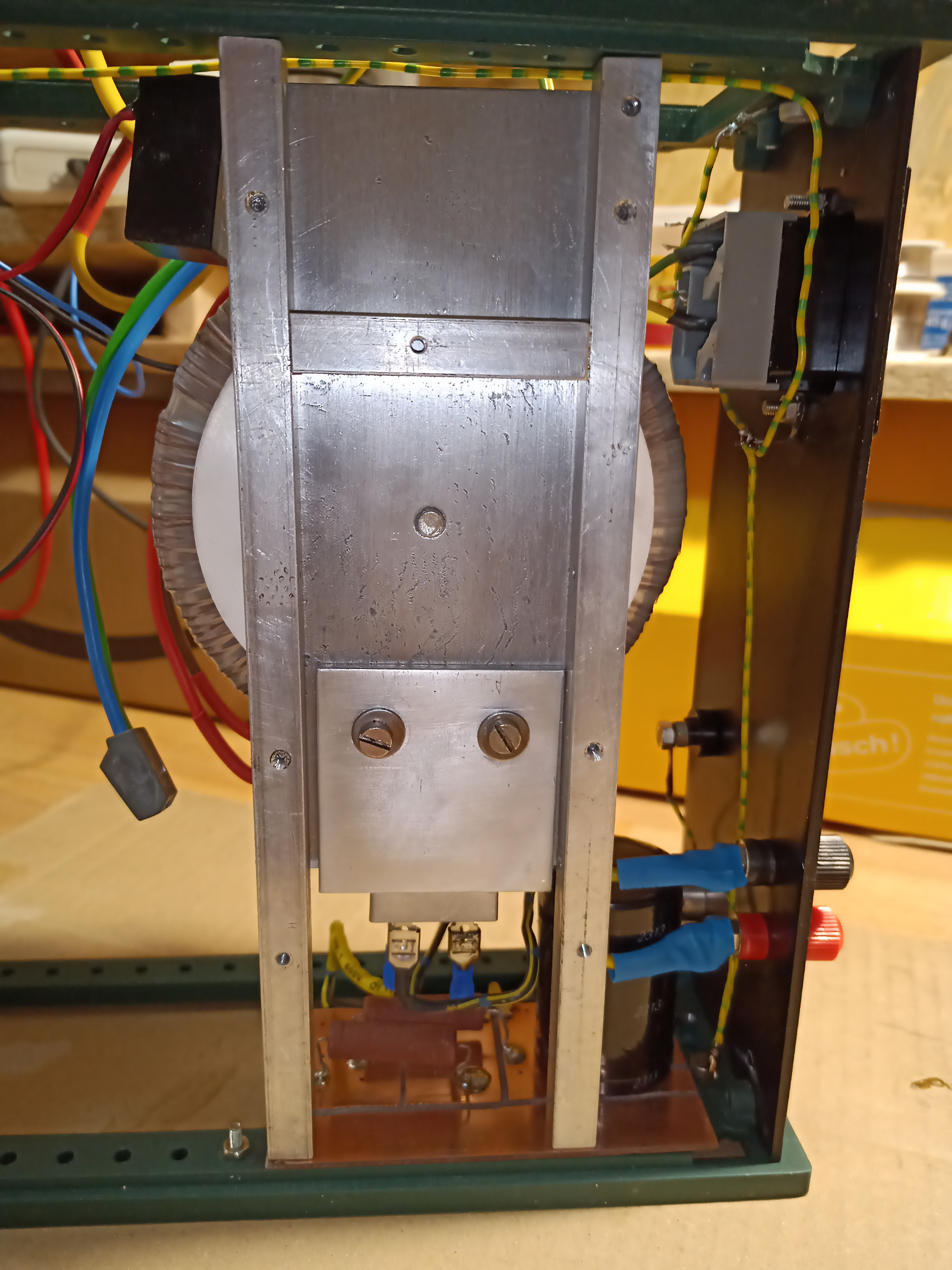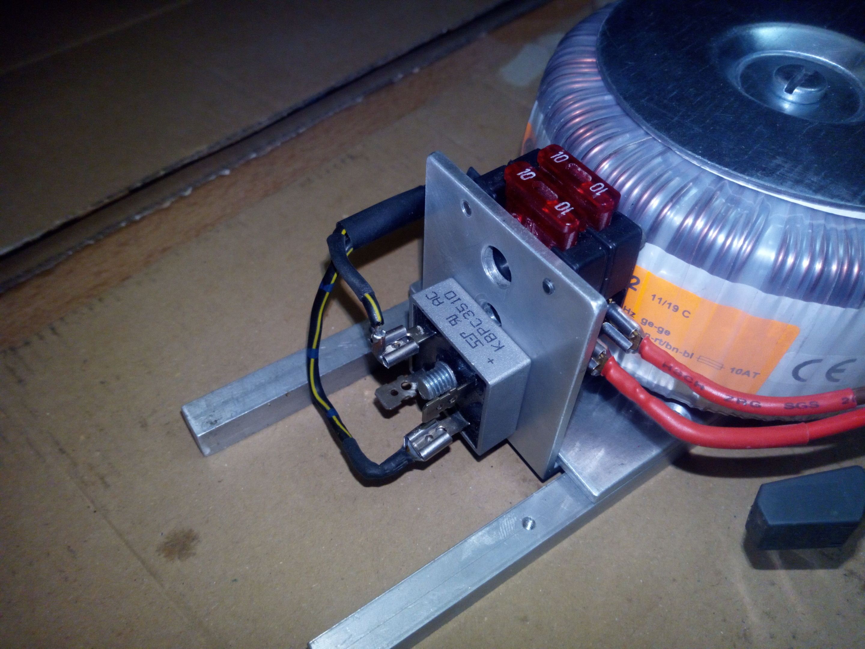 The transformer is quite heavy, so a stable construction in the housing was necessary. Aluminum was used as the material, which can also dissipate heat. The transformer sits on a 4mm thick aluminum sheet which in turn is held in the housing by 10mm square struts. The construction is also used to cool the rectifier, which was screwed to an aluminum bracket.