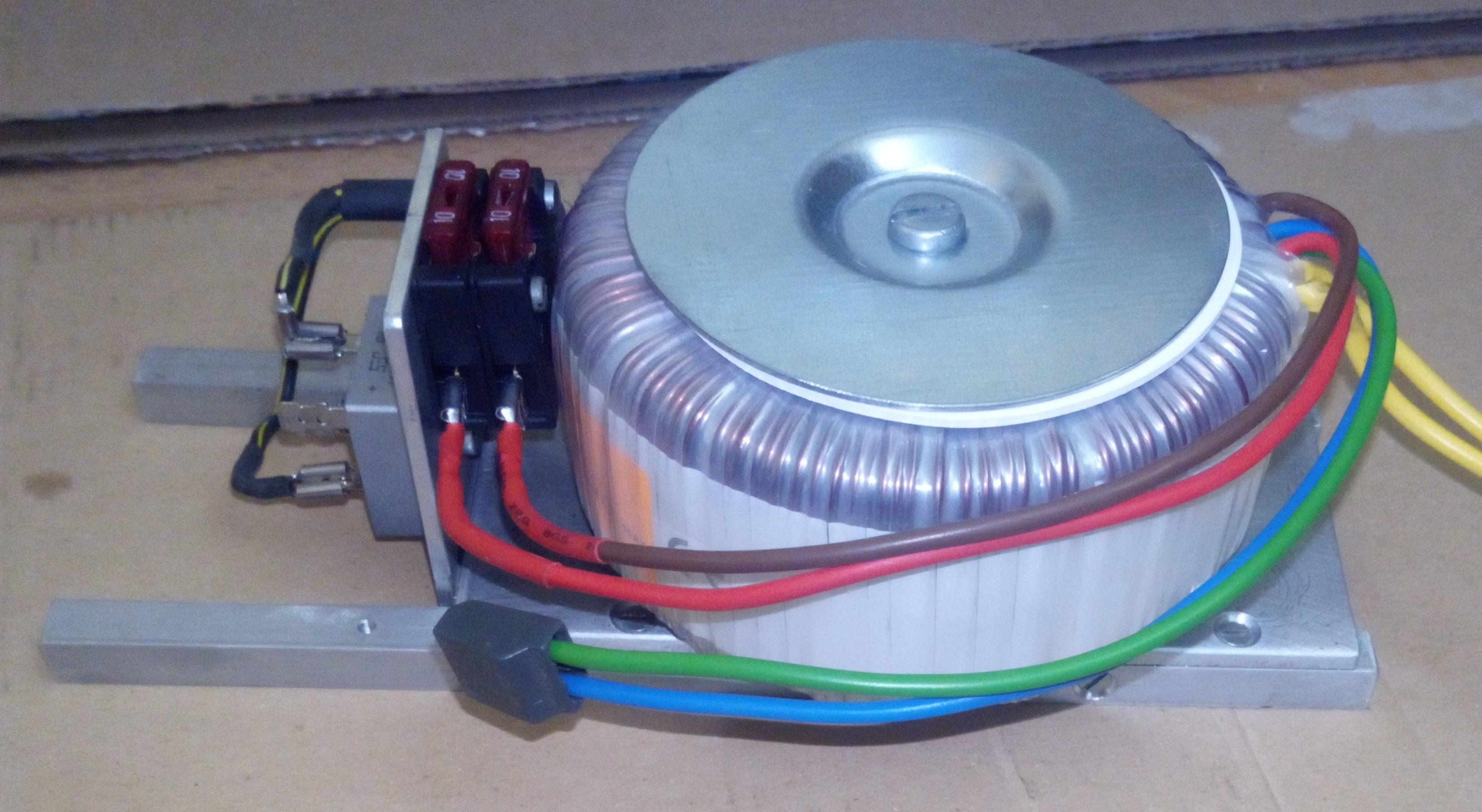 Im Test der Komponenten hat sich gezeigt, dass sich der Trafo für ca. 30 Minuten mit 600VA belasten lässt. Das sind das rund 16 Ampere die entnehmbar sind. Bei Kurzschluss gibt das dann schon einen kräftigen Schweißfunken der an Metallen kleine Krater hinterlässt. Die im Bild zu sehenden 10 Ampere KFZ-Sicherungen wurden mittlerweile durch 20 Ampere Typen ersetzt. Ich habe für jeden Leiter eine Sicherung gewählt. Denkbar ist auch der Einsatz nur einer Sicherung zwischen grünem und blauem Leiter im gezeigten Bild.