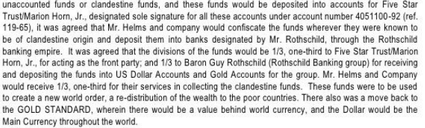 UNITED STATES OF AMERICA (18 November 2009) – FIVE STAR TRUST, an asset trust management company with monies, gold and other assets valued above $900 trillion dollars is currently making strident efforts to have U.S. monies returned from banks abroad. In a 1997 tri-lateral agreement made between Mr. Marion Horn, an executive trustee of Five Star Trust; the late Baron Guy Rothschild, head of the legendary Rothschild Family; and Mr. Richard Helms, former Director of the Central Intelligence Agency in which each part was designated one-third of the assets, Mr. Horn emphatically stated that “funds be used for the citizens of the United States…”