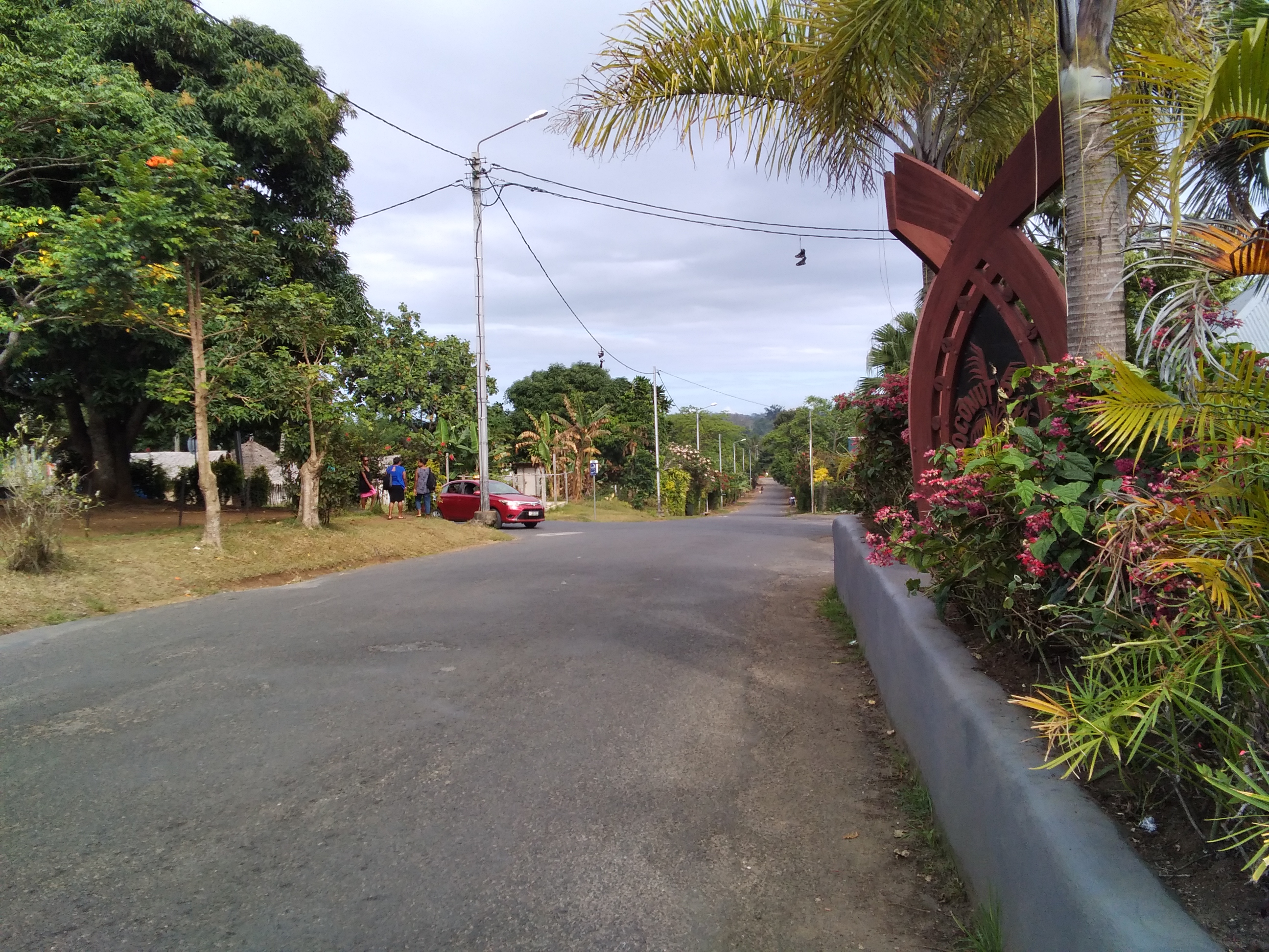 I settled into a rusty old minivan with red and black naugahyde apolstery and we raced through the back streets of this old colonial town dodging locals on scooters and kids wandering in the street until we made our way to my hotel. A apartment building renovated to be a motel situated up n a hill that overlooks the lagoon and ocean. Across the street was the state school. Kids played and ran about in the muddy dirt field that it sat in. Looking down the street the houses were obscured behind veils of various palms, banana and flowering frangipani trees.