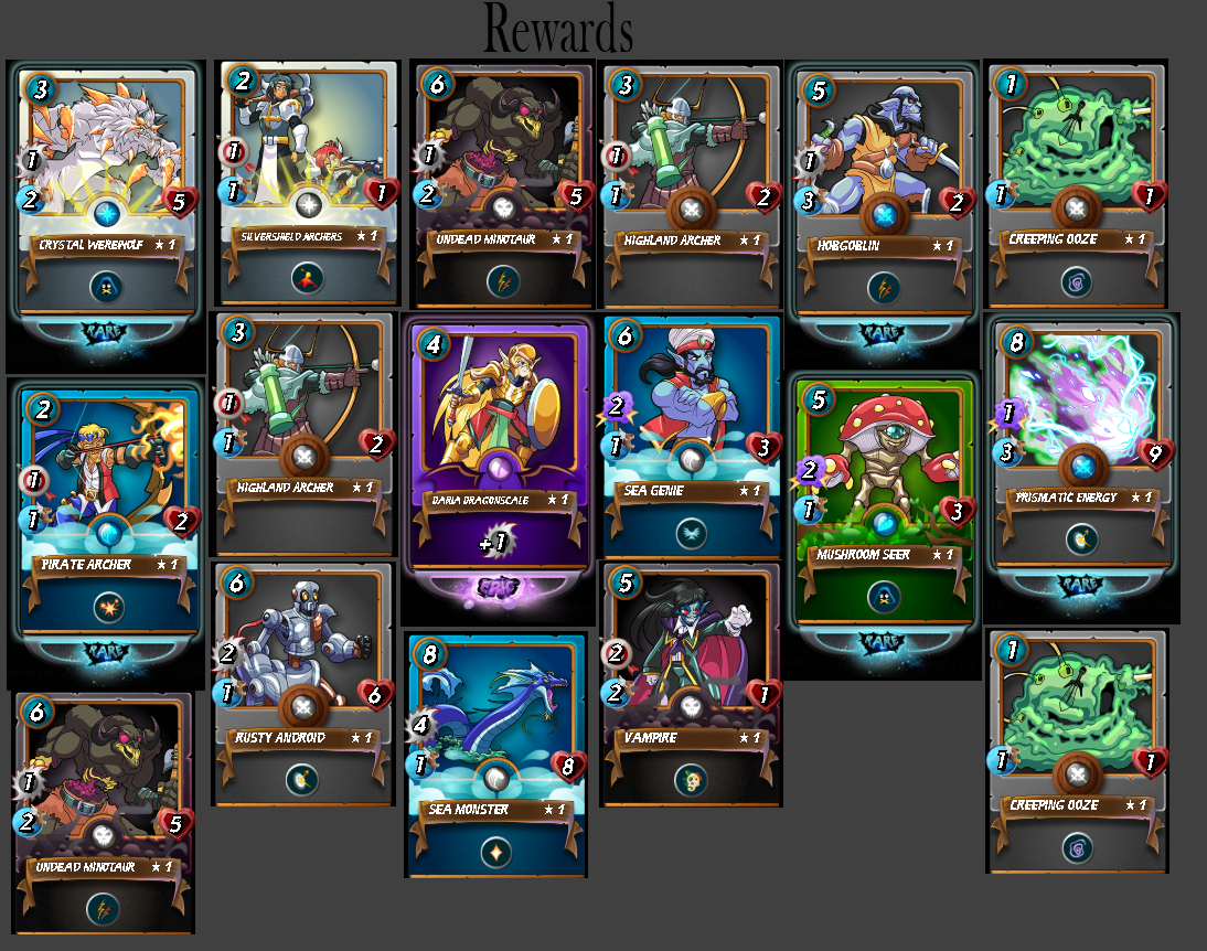 Hello, every week, I'll be going over my daily rewards for the last seven days in SteemMonsters, and running a giveaway. If a season has just ended, multiple cards will be given away. The giveaway will run until post payout. Good luck to all entrants.