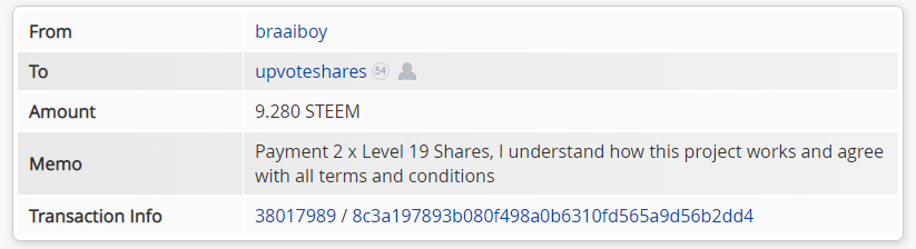 Payment "enter amount of shares" Level 19 Shares, I understand how this project works and agree with all terms and conditions (https://steemit.com/steemit/@upvoteshares/upvote-shares-or-terms-and-conditions)