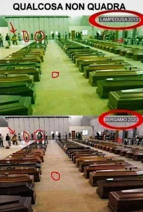 Także, lekcja z historii została odrobiona i wprowadzona w życie. Publikowanie news'ów z trupami, trumnami, reanimowaniem manekinów itp, plus cenzurowanie social mediów (takich jak: FB, YouTube...) dało w sumie dobre rezultaty. Ludzie wierzą w to co widzą.Dla przykładu obrazek z października 2013 roku (ofiar katastrofy kutra u wybrzeży wysp Pelagijskich na Morzu Śródziemnym we Włoszech) i obrazek (ofiar covid'u w Bergamo) z kwietnia 2020 roku.