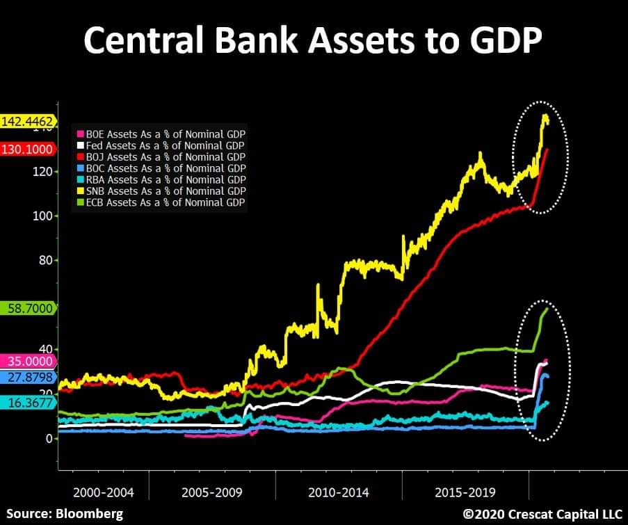 Dla niewtajemniczonych, tak mniej więcej wygląda zwiększenie ilości pieniądza w systemie. Banki Centralne w ostatnich 8 miesiącach, wykreowały tyle pieniędzy, co przez ostatnie 8 lat. (Najwyższy wskaźnik na tym wykresie to Narodowy Bank Szwajcarii i 142% swojego PKB, dodrukowane z powietrza. Zaraz za nim Bank Centralny Japonii z 130% PKB i Europejski Bank Centralny z 57,8% PKB nowych Euro). To oznacza, że polityka niskich kosztów kredytu/zadłużania się będzie kontynuowana, aż do upadku obecnego systemu monetarnego, a następnie przejścia na system walut cyfrowych, podlegających pod Banki Centralne (czytaj: system pełnej kontroli nad obywatelem).